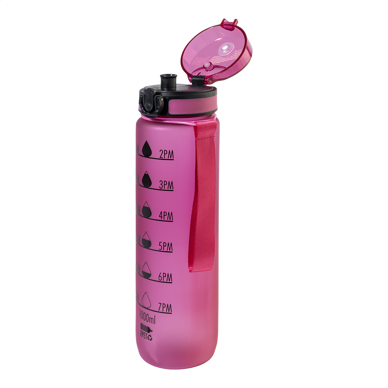 Sportovní láhev z matného RPET s motivačním objemovým a časovým značením, s automaticky otevíratelným odklápěcím víčkem s bezpečnostním zámkem a poutkem na nošení. 1000 ml. Bez BPA. Nevhodné pro sycené nápoje.