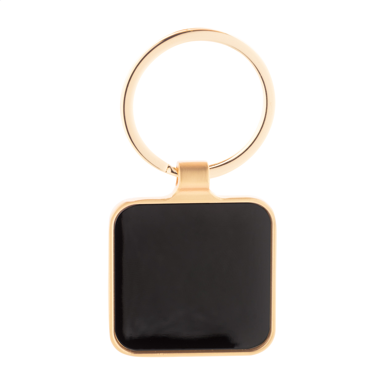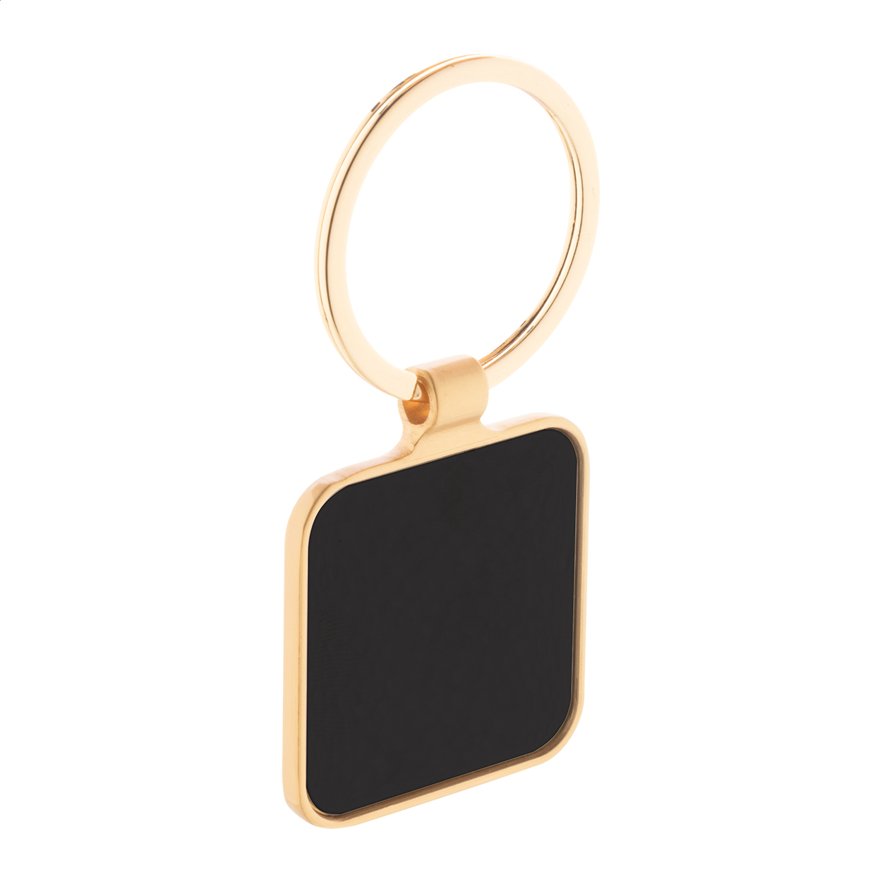 Kovový přívěsek na klíče čtvercového tvaru ve zlatém provedení s bronzovou destičkou. V kraftové papírové krabici.