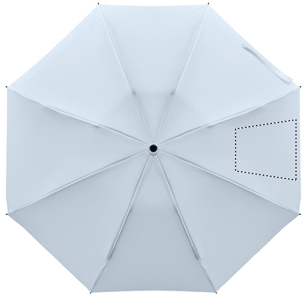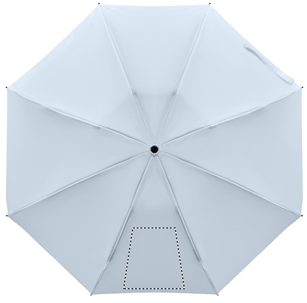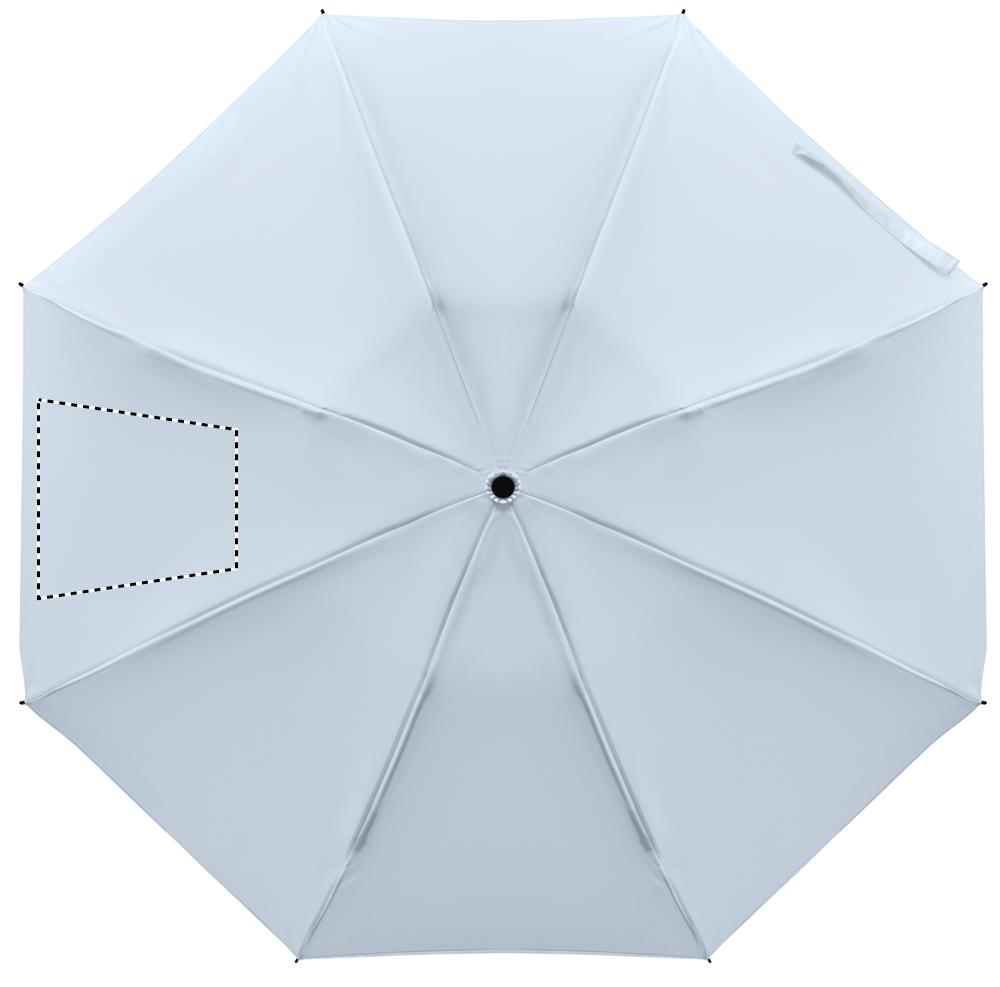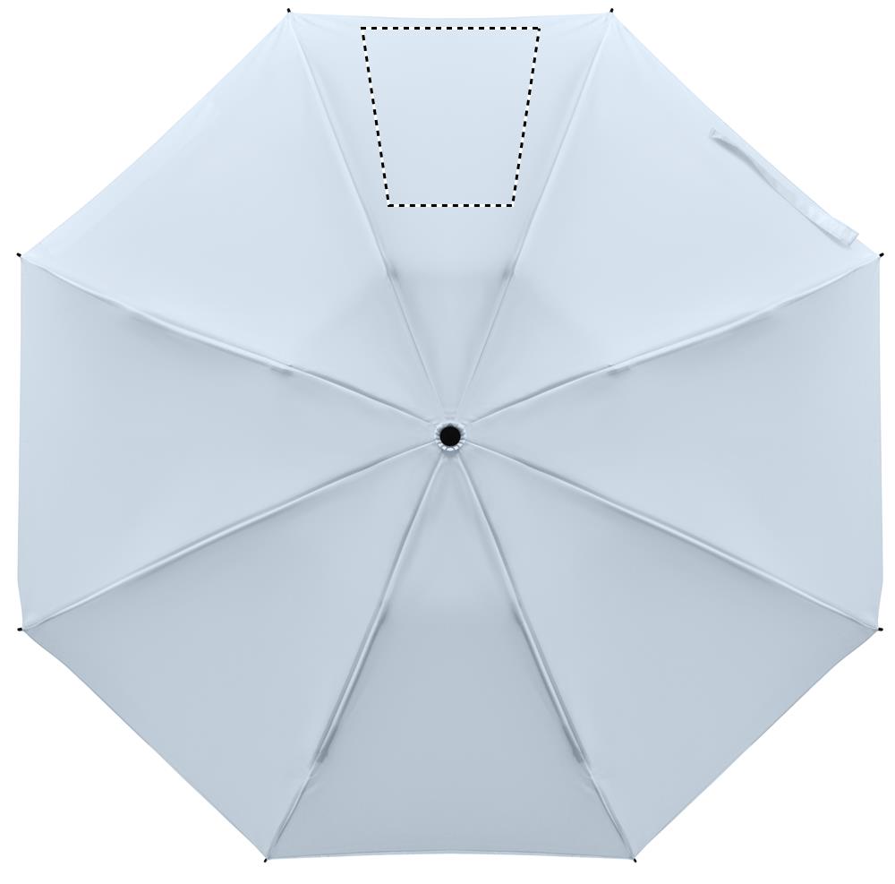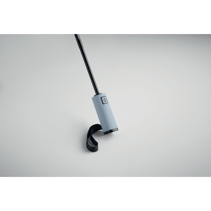 23palcový skládací větruodolný deštník ze 190T RPET pongee v obalu. Automatické otevírání a zavírání. Černá pokovená tyč, žebra ze sklolaminátu a rukojeť z ABS s gumovou povrchovou úpravou.