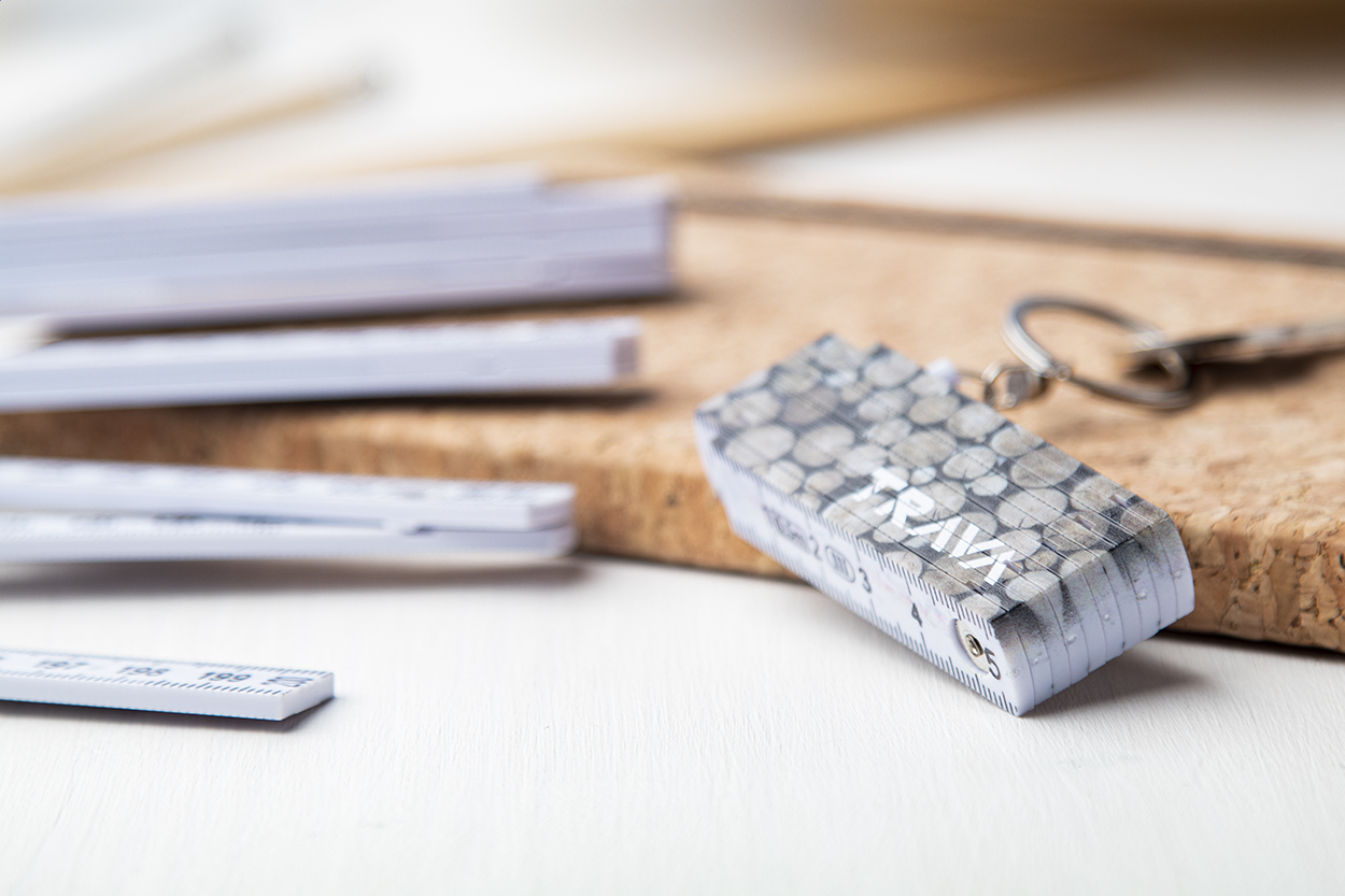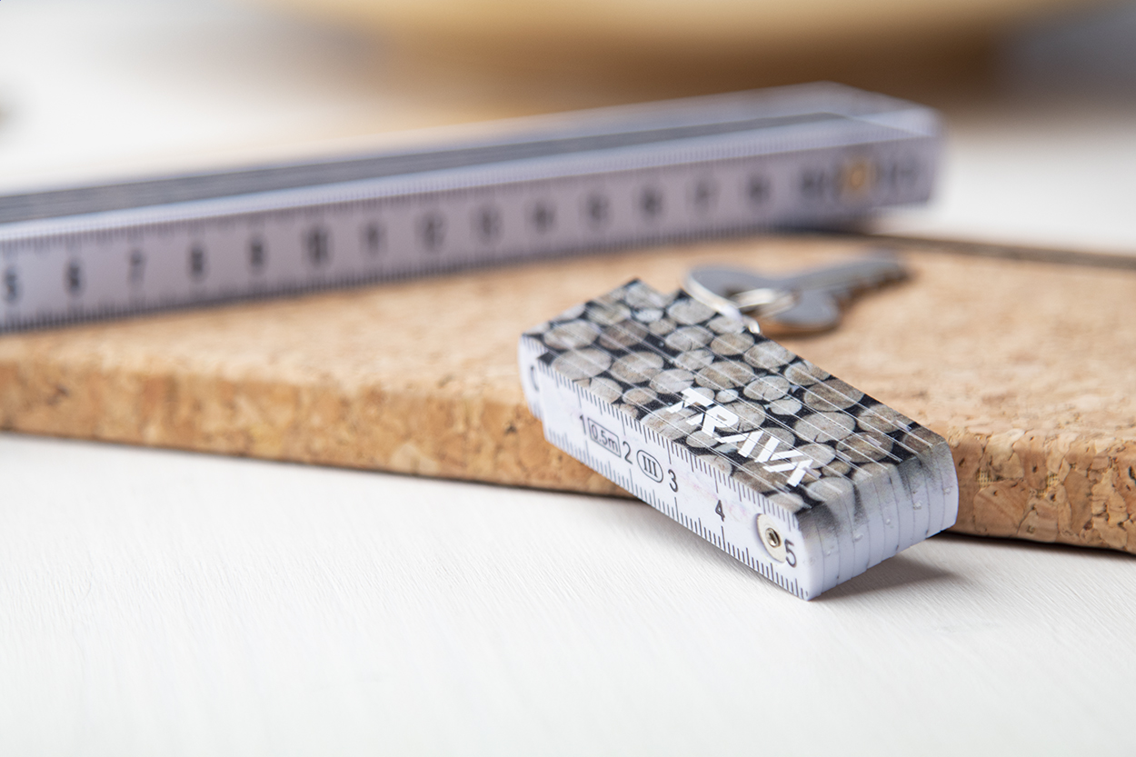 Plastový skládací mini metr s kovovým kroužkem na klíče. Délka 50 cm.