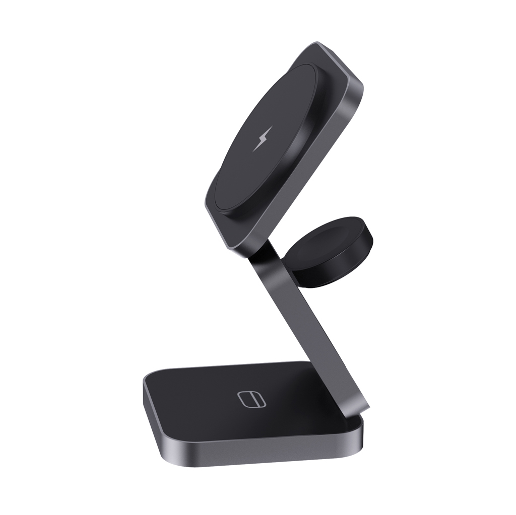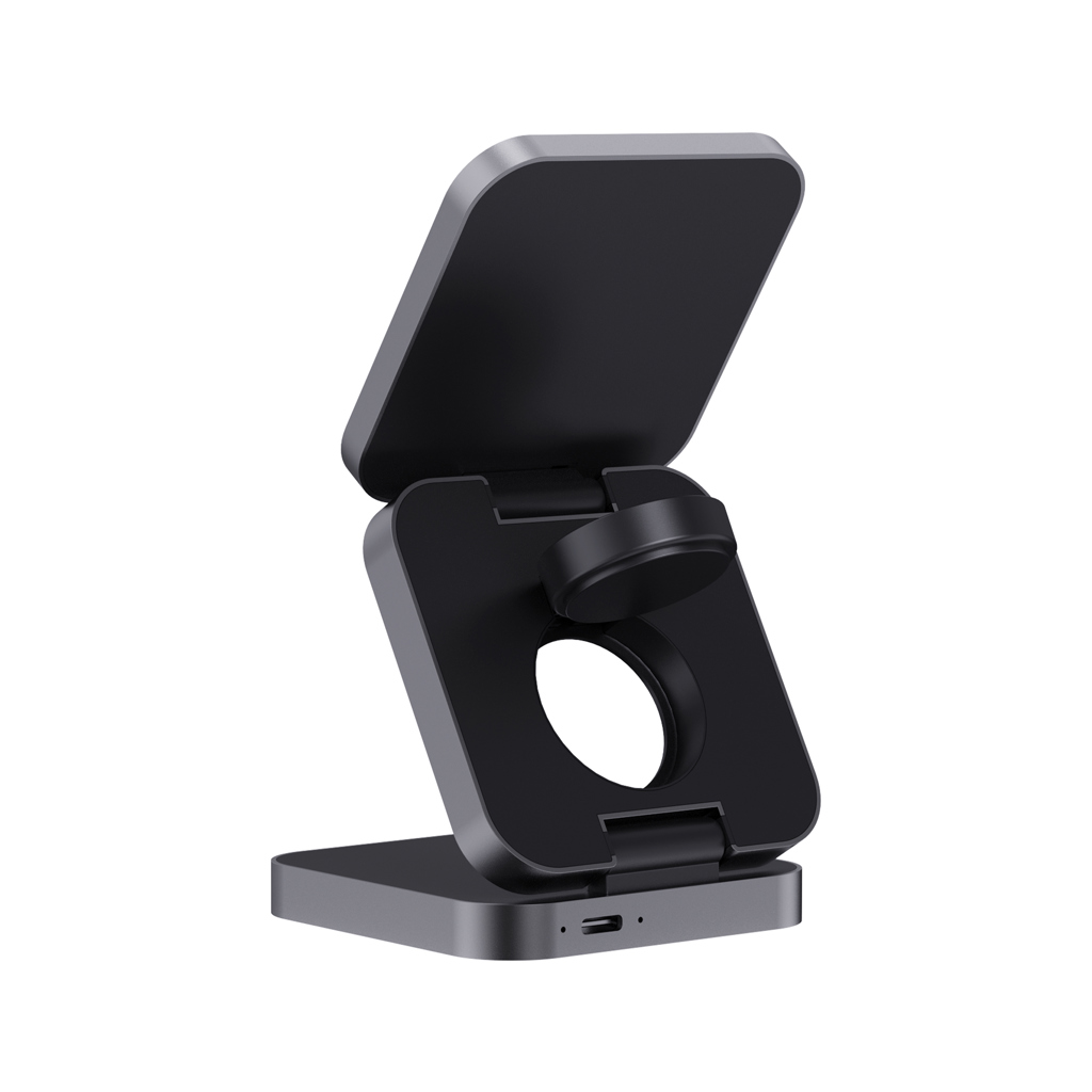 Skládací bezdrátová nabíječka 3 v 1. Magnetická 15 W část pro větší zařízení, 5 W část pro menší zařízení (např. sluchátka), 2,5 W část pro chytré hodinky (pouze Apple Watch). Vyrobené z RCS recyklovaného ABS a hliníku. Celkový podíl recyklátu dle váhy produktu: 46 %. RCS certifikace zajišťuje garanci použití recyklovaného materiálu díky transparentnímu přehledu nad dodavatelským řetězcem. Včetně 120cm USB C kabelu z RCS recyklovaného TPE. Baleno v FSC® kraftové krabičce. Vstup pro optimální použití: 9V/3A. Výstup: velká část: 9V/1.1A; 9V/1.67A (15W), střední část: 5V/1A (5W), část na hodinky: 5V/0.5A (2.5W). Bez PVC.