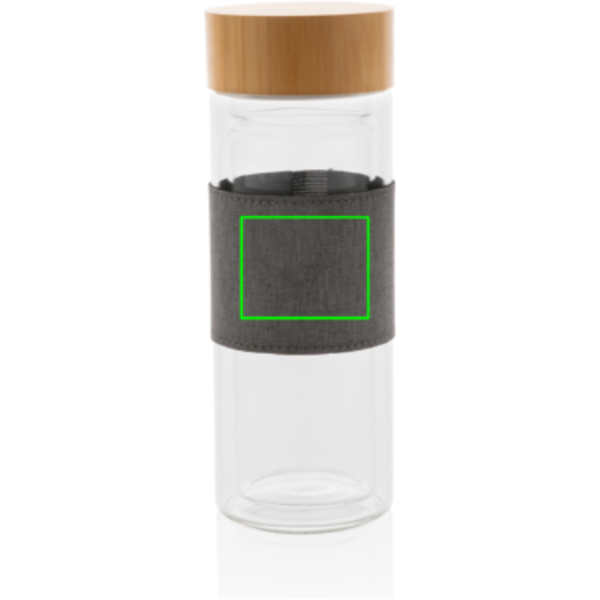 Skleněná lahev vyrobená z kvalitního borosilikátového skla odolného i vysokým teplotám. Lahev má bambusový uzávěr a stylový úchop vyrobený z recyklovaných PET lahví (rPET). Díky dvojité stěně lahev v rukou nepálí i při naplnění vroucím nápojem. Objem 360 ml. Bez BPA.