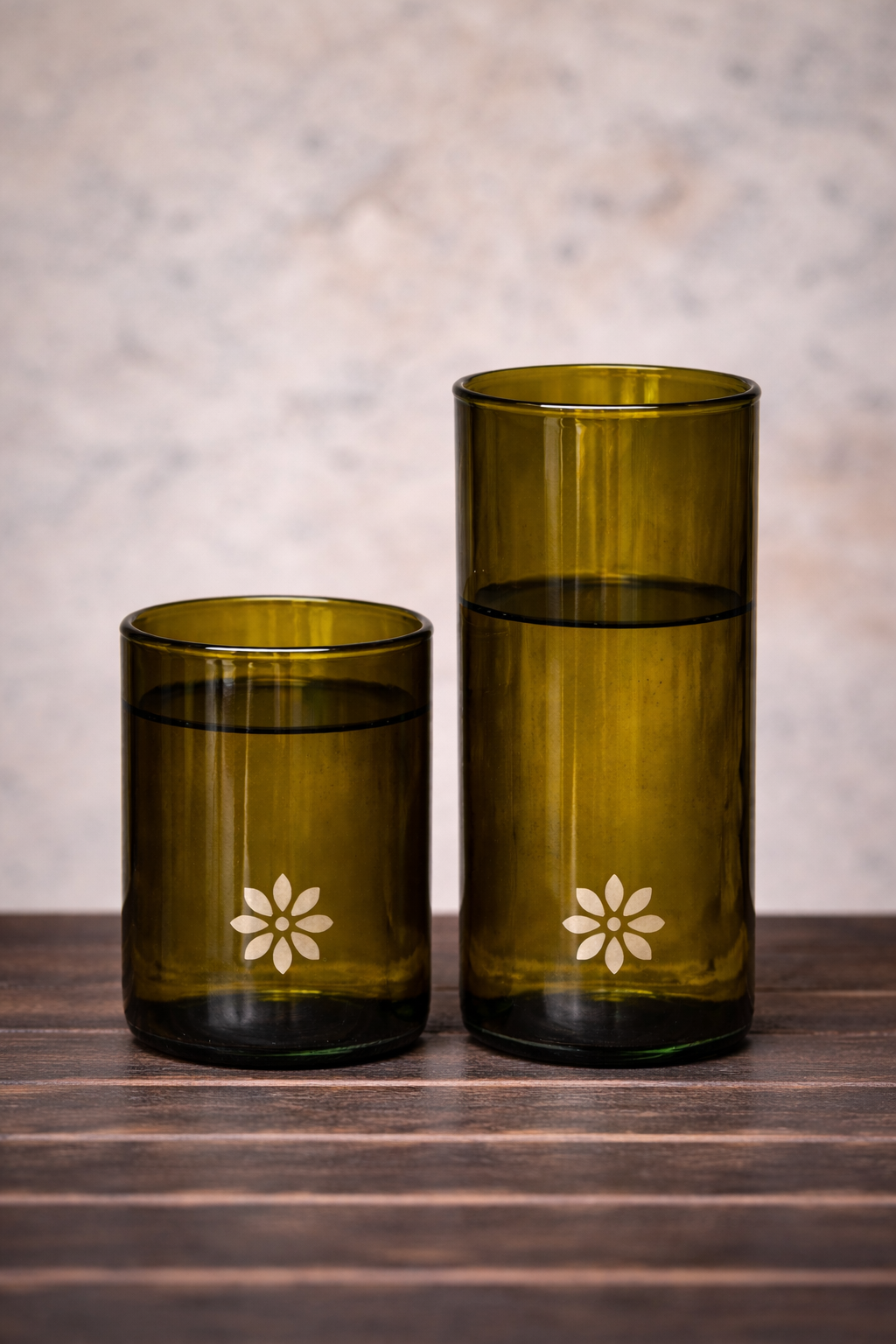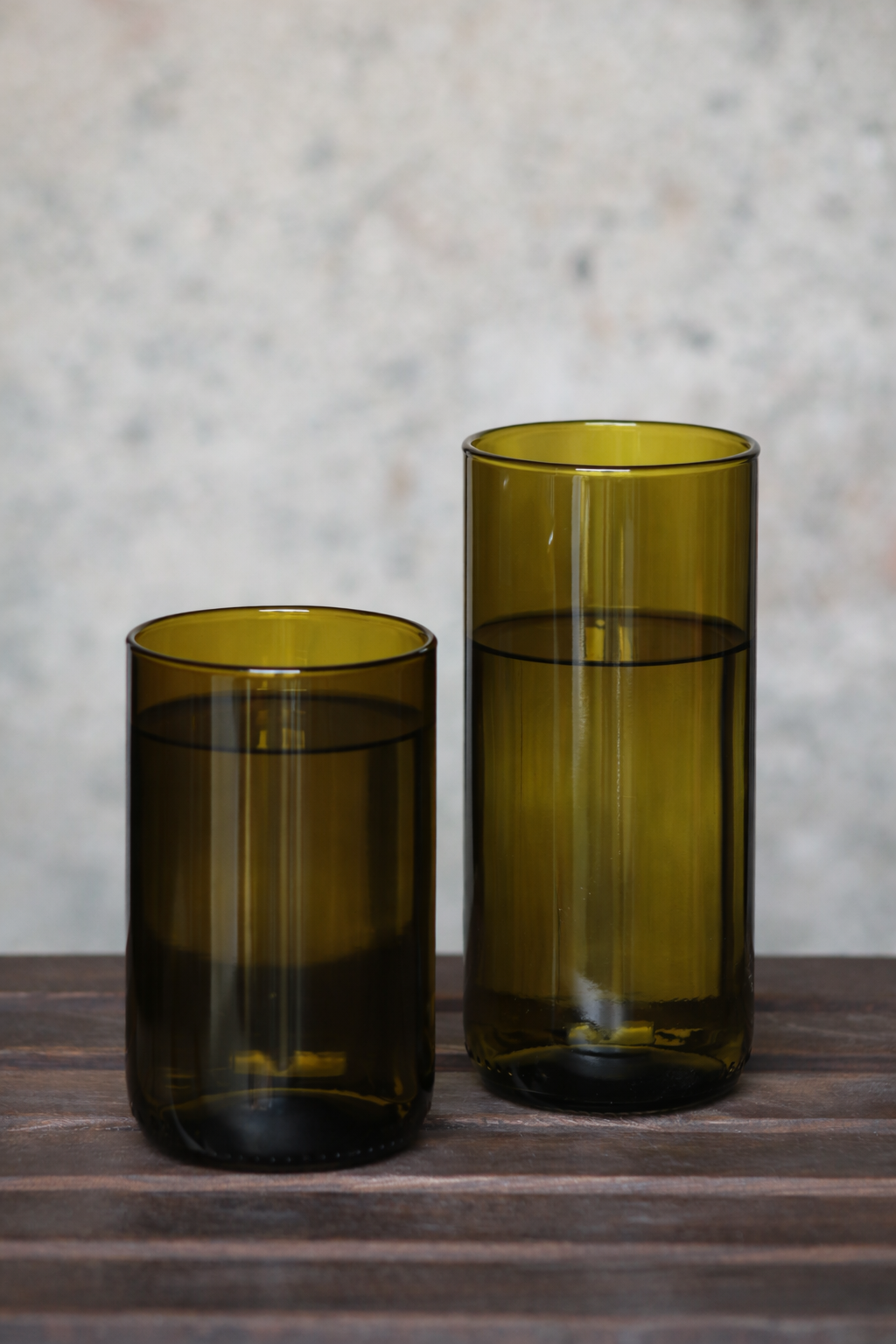 Sklenice jsou vyrobené z lahví od vína a mají jednoduchý, nadčasový tvar. Sklo je masivnější, takže sklenice působí pevně a stabilně. Okraj je ručně otavovaný a dokonale hladký, dno je téměř ploché.