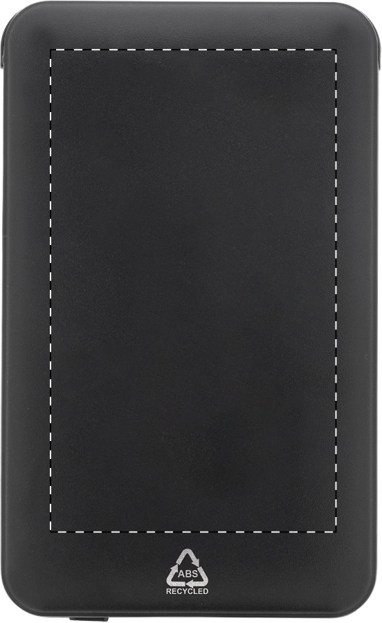 Power banka z recyklovaného ABS plastu s baterií 5 000 mAh a integrovanými nabíjecími kabely s konektory micro USB, USB-C a Lightning. S nabíjecím portem USB a vstupním portem USB-C. Včetně nabíjecího kabelu USB.