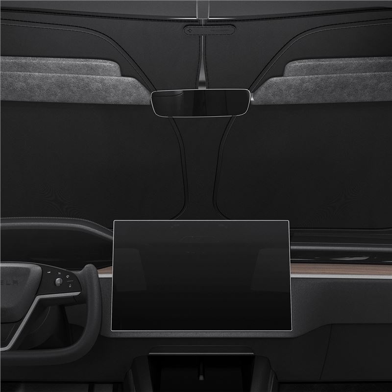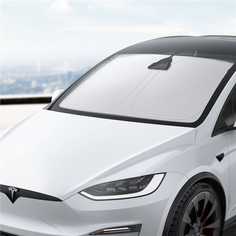 Sluneční clona pro čelní sklo vozu Tesla Model X (ročník 2021 a novější) zamezuje přehřívání interiéru během parkování na slunci. Kvalitní nylonový materiál blokuje UV záření a chrání palubní desku i potahy sedadel před vyblednutím a popraskáním.