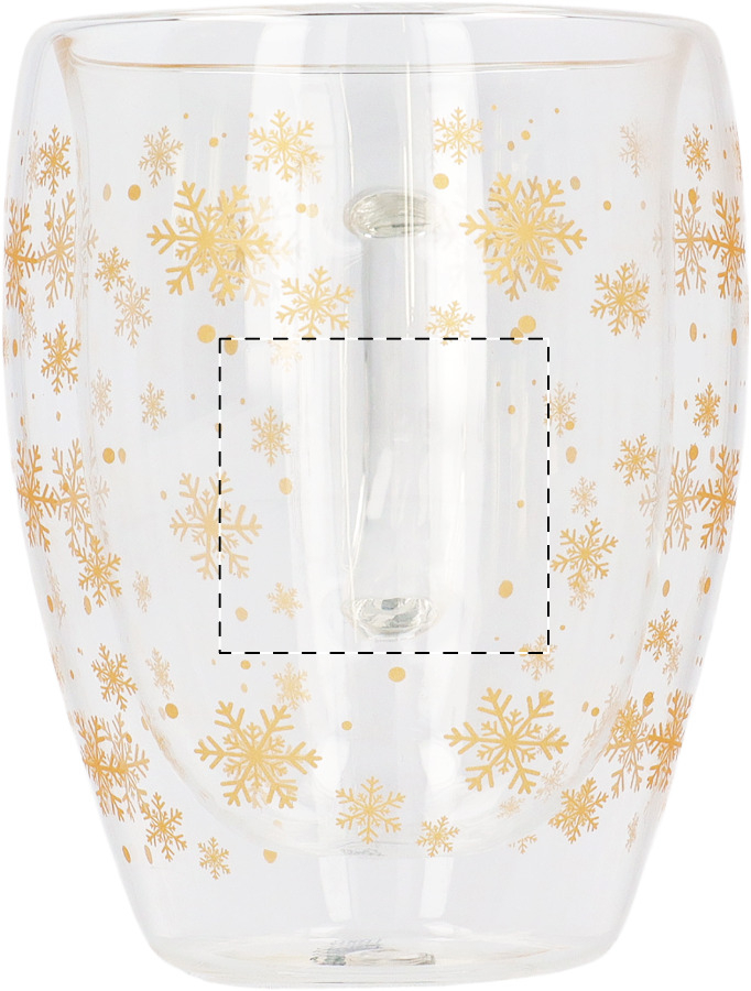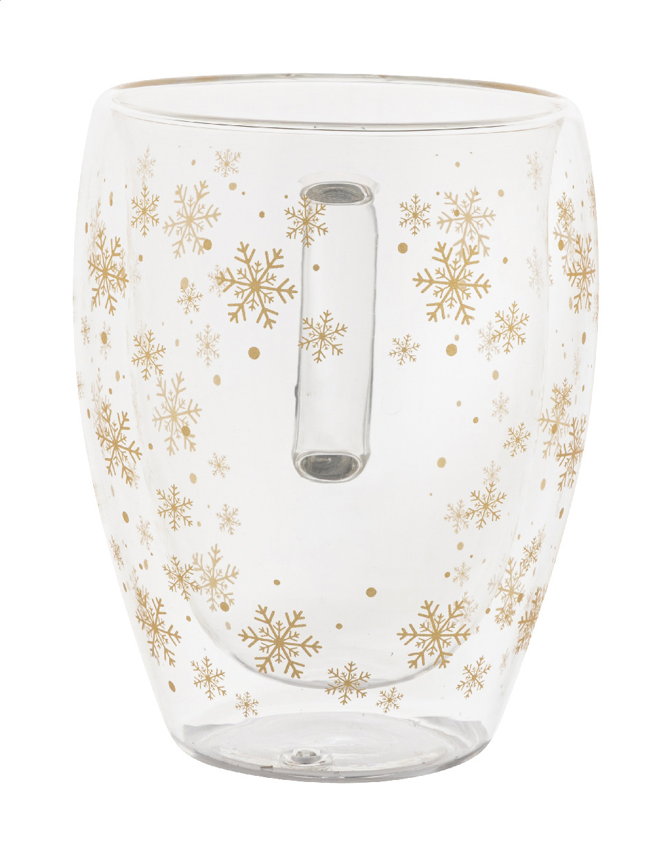 Dvoustěnný termohrnek z borosilikátového skla s motivem vánočních sněhových vloček, 350 ml. V krabičce z kraftového papíru.
