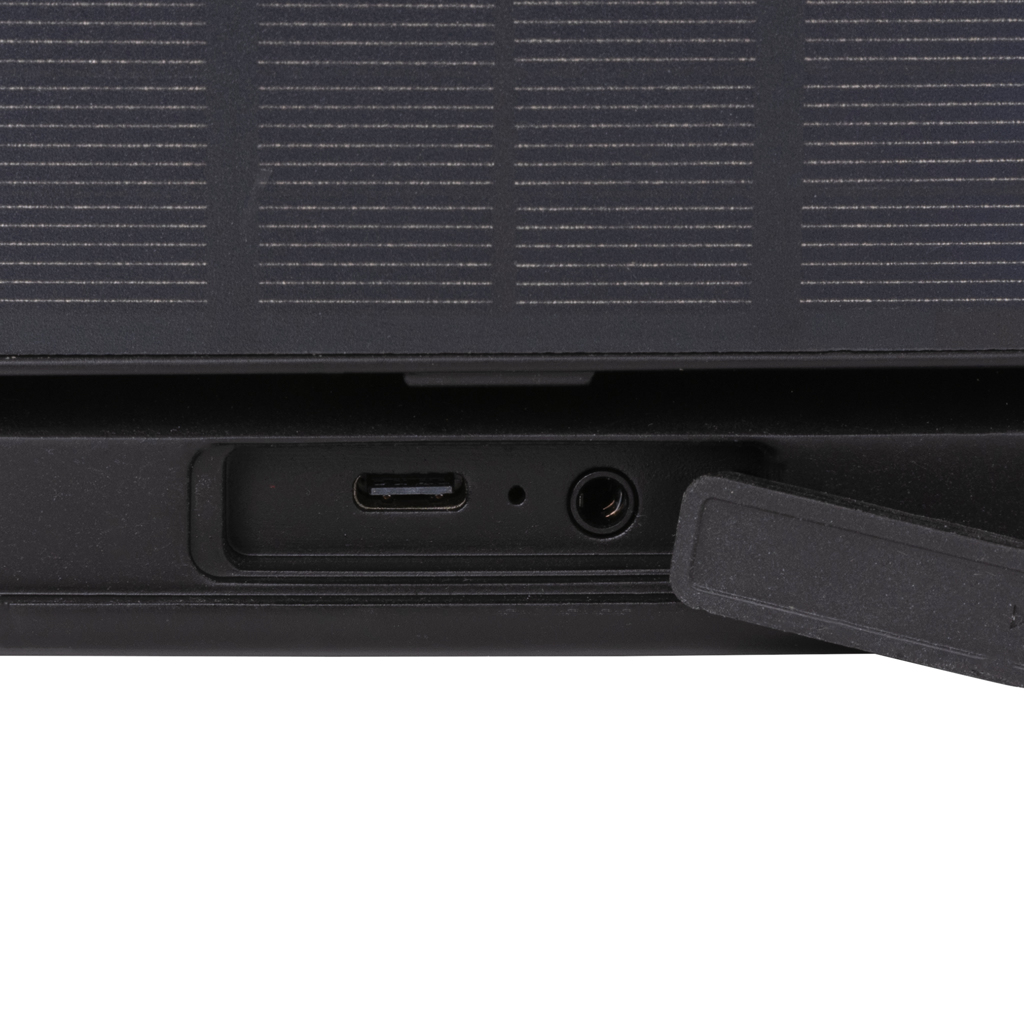 Výkonný 12 W bezdrátový reproduktor s integrovaným velkým solárním panelem. Panel využívá vysoce kvalitní monokrystalické solární panely s konverzním poměrem 19 %. Rychlost solárního nabíjení: 5V/300 mA. Stupeň nabíjení vždy závisí na slunečních podmínkách. Baterie s kapacitou 1500 mAh zajišťuje poslech po dobu až 8 hodin. BT 5.3 pro optimální bezdrátové připojení na vzdálenost až 10m. Mikrofon pro telefonování. Zabudované LED světlo. Vyrobené z RCS recyklovaného ABS. RCS (Recycled Claim Standard) je globální standard, který umožňuje ověřit použití recyklovaného materiálu v produktu napříč celým dodavatelským řetězcem. Celkový podíl recyklátu dle váhy produktu: 16 %. Včetně nabíjecího kabelu z RCS recyklovaného TPE. Baleno v FSC dárkovém balení.