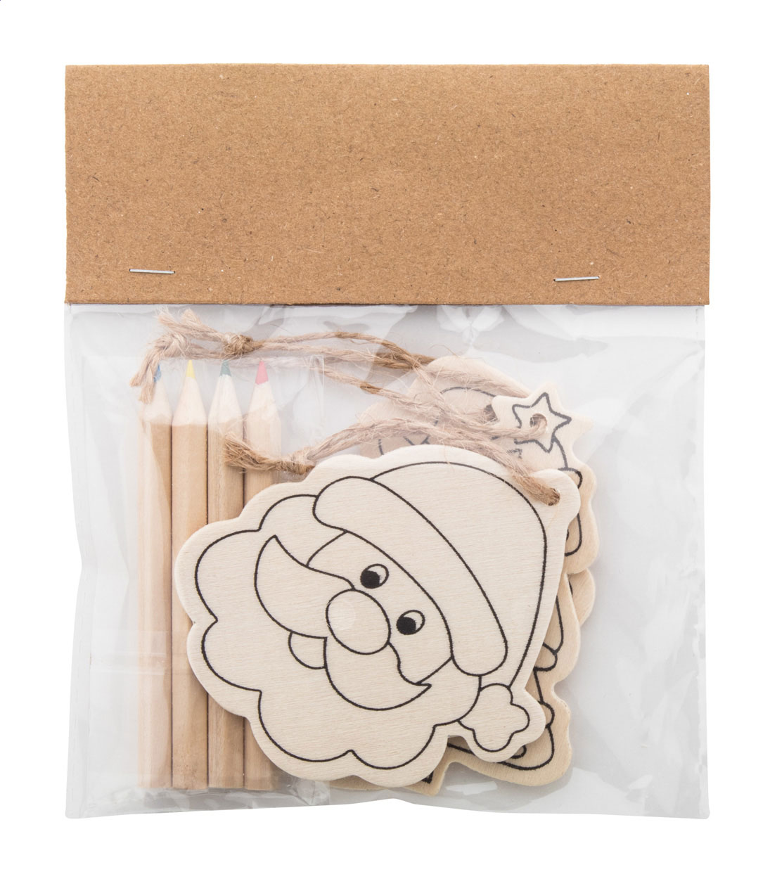 Vánoční ozdoby na vybarvení s kraftovým papírem na obalu. Včetně 3 ks dřevěných ozdob s konopnou šňůrou (Mikuláš, vánoční stromeček a sněhulák) a 4 ks barevných tužek.