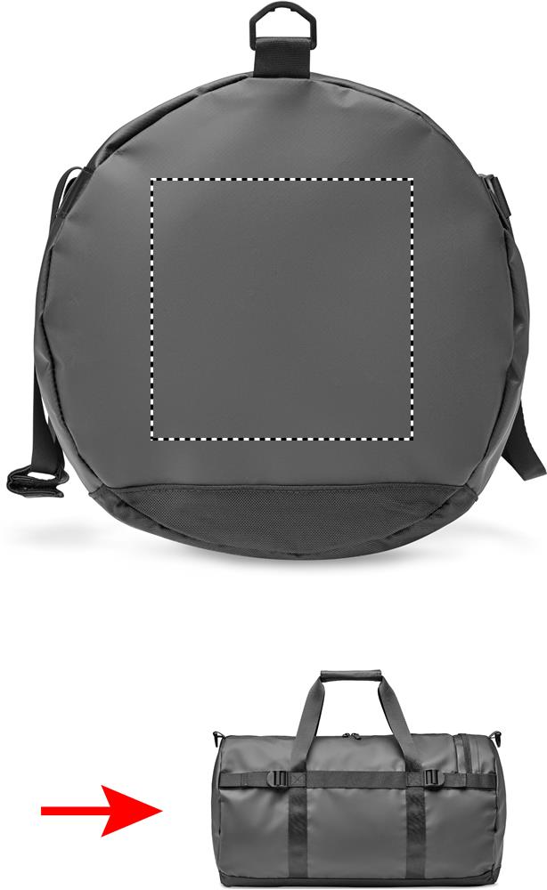 Sportovní nebo cestovní taška z materiálu 50C Tarpaulin s boční přihrádkou na zip a vnitřní kapsou na zip. Má pohodlnou rukojeť a polstrované dno.