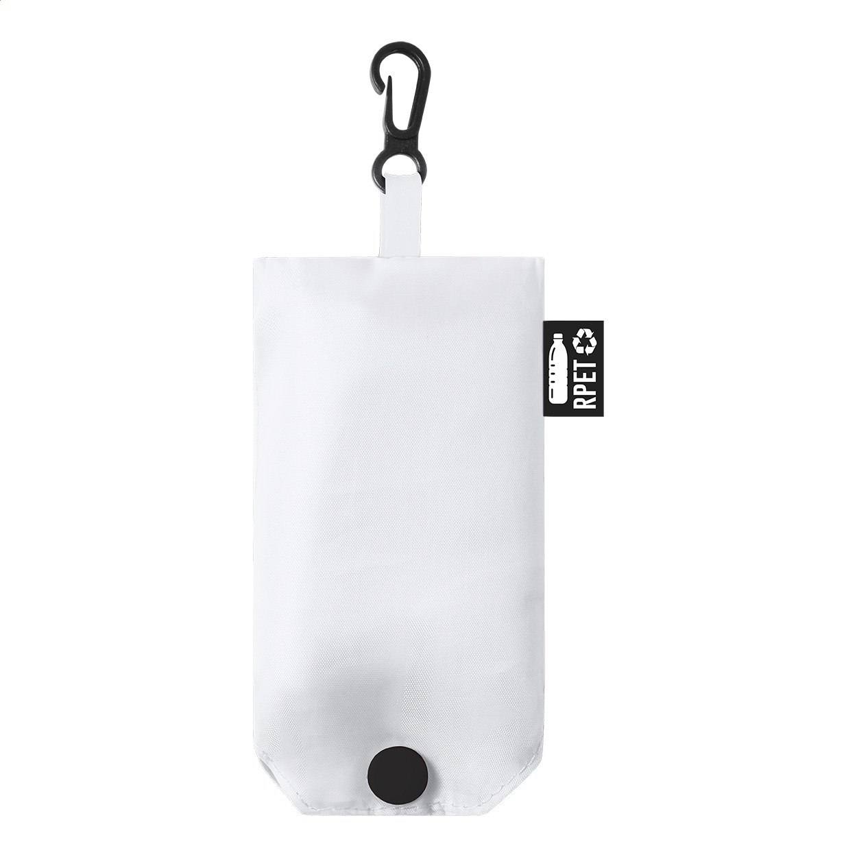 Skládací nákupní taška z RPET (recyklovaný PET) polyesteru s etiketou s označením RPET.