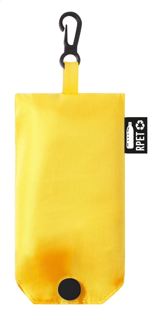 Skládací nákupní taška z RPET (recyklovaný PET) polyesteru s etiketou s označením RPET.