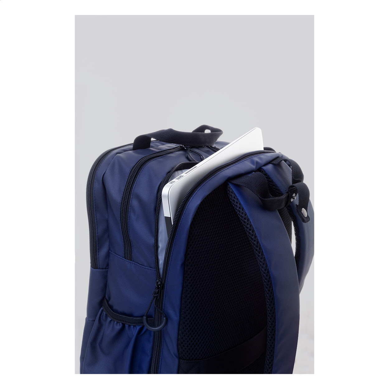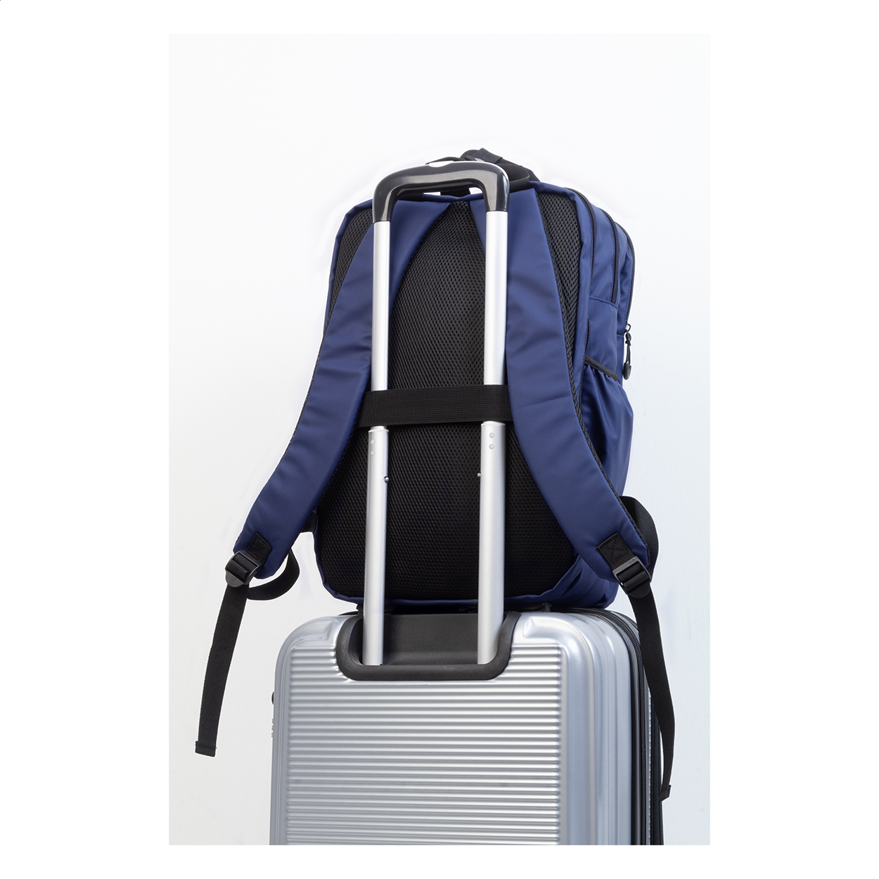 Vodotěsný batoh RPET se 2 přihrádkami na zip, 2 předními kapsami na zip, bočními kapsami a polstrovanou přihrádkou na notebook (16"). S popruhem na vozík, polstrovanými zády a ramenními popruhy. Polyester 600D RPET potažený PU, s výrazným štítkem RPET.