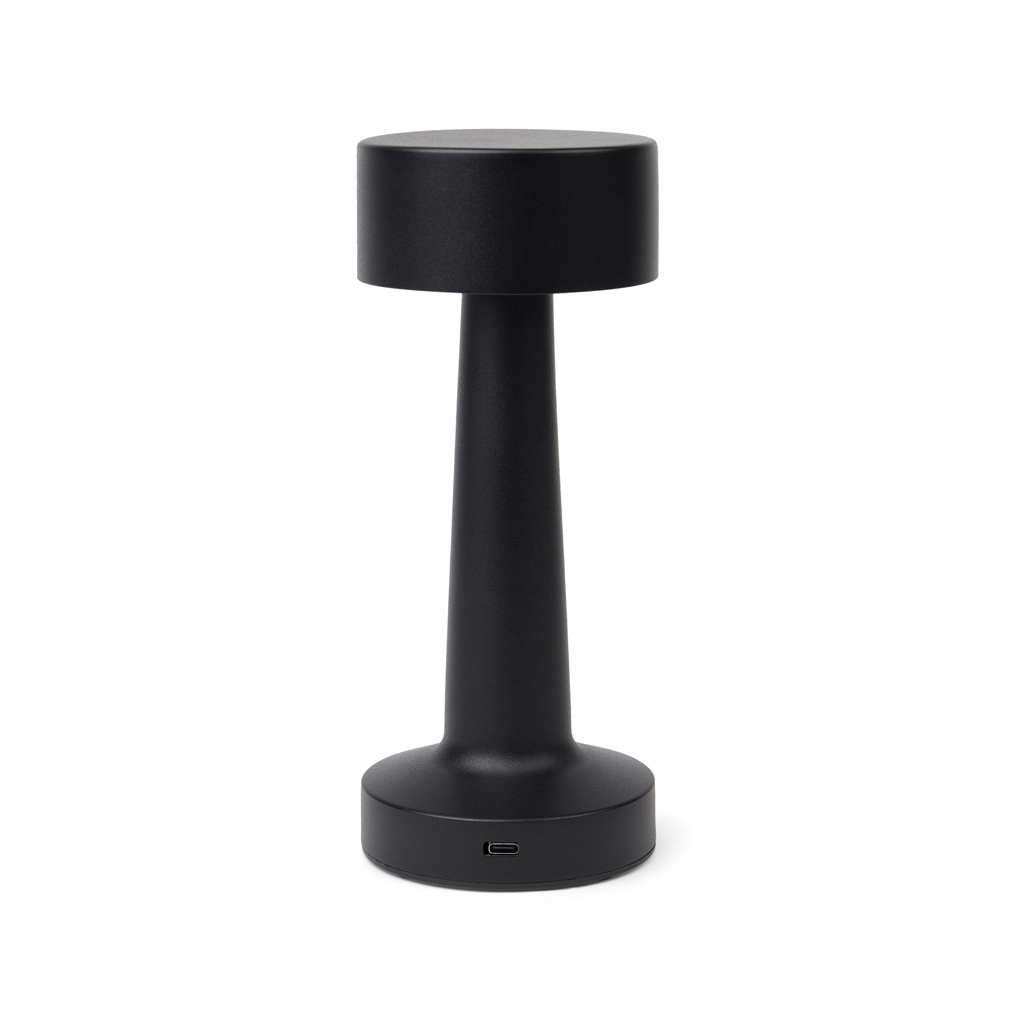 Moderní černá stolní lampa z kovu a recyklovaného plastu přináší do pracovního prostoru příjemné osvětlení s dlouhou výdrží. Integrovaný akumulátor umožňuje svícení bez připojení do sítě po celých 8 hodin.