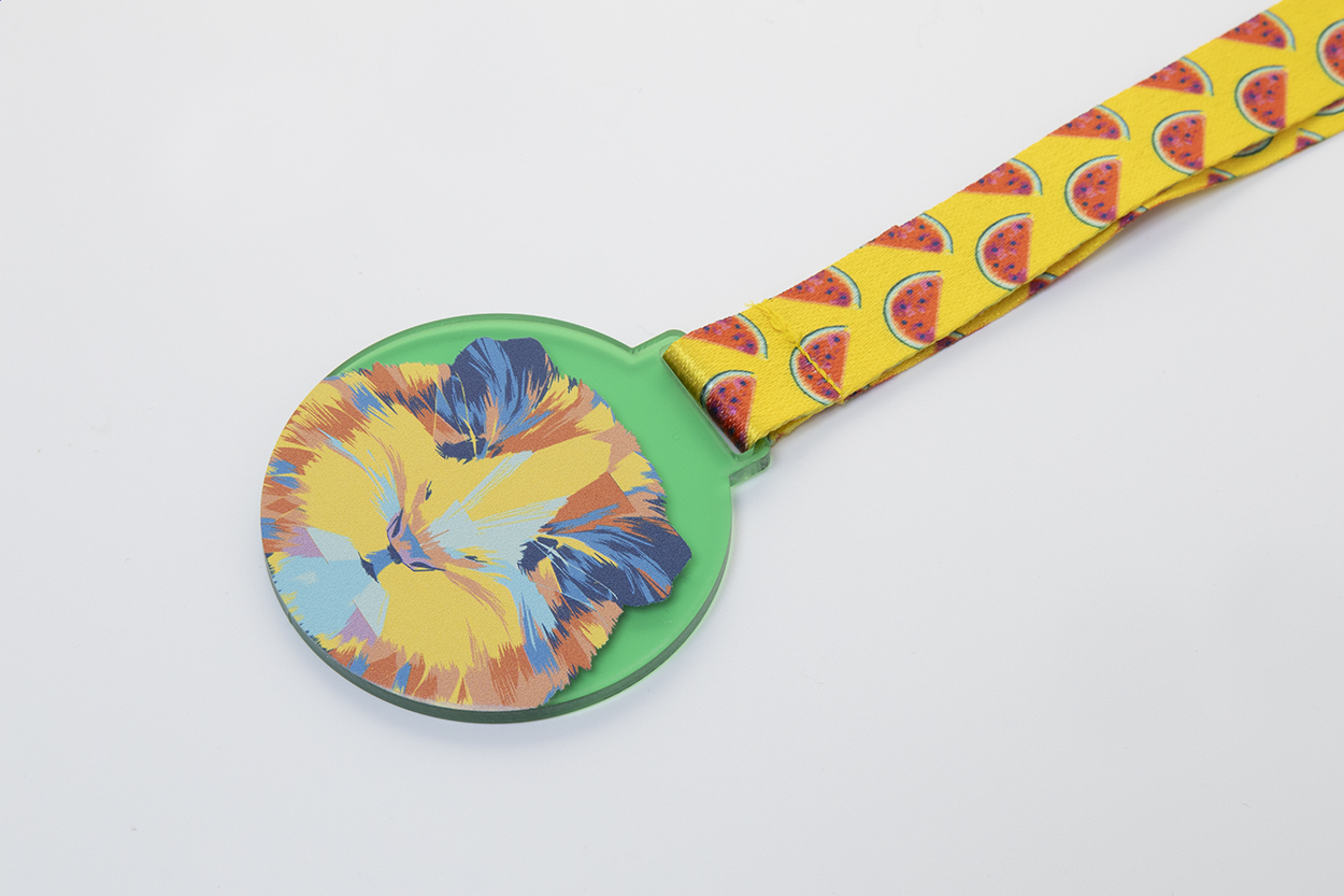 Zakázková akrylová medaile s plnobarevnou grafikou. Na sublimačním potištěném RPET lanyardu. Cena zahrnuje sublimaci a UV LED tisk, nezahrnuje tiskové přípravy. Min. mn.: 100 ks.