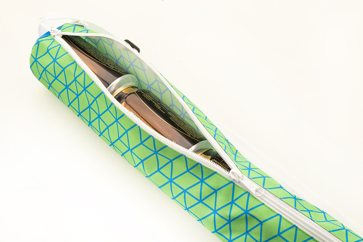Taška na plechovky vyrobená na zakázku z 600D RPET polyesteru s přihrádkou na zip a nastavitelným ramenním popruhem. S celoplošným sublimačním potiskem a výraznou RPET etiketou. Vhodná pro 5 ks standardních hliníkových plechovek o objemu 0,33 l. Min. mn.: 25 ks.