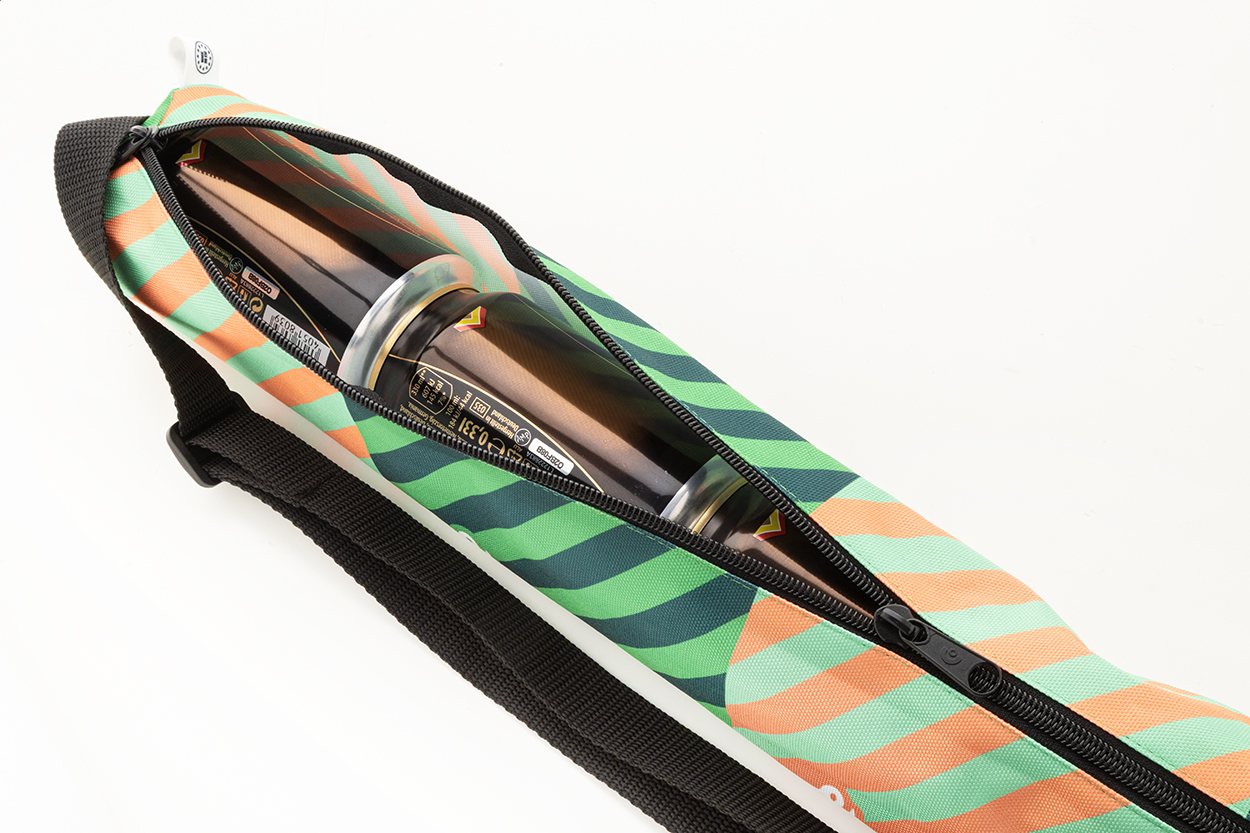 Taška na plechovky vyrobená na zakázku z 600D RPET polyesteru s přihrádkou na zip a nastavitelným ramenním popruhem. S celoplošným sublimačním potiskem a výraznou RPET etiketou. Vhodná pro 5 ks standardních hliníkových plechovek o objemu 0,33 l. Min. mn.: 25 ks.