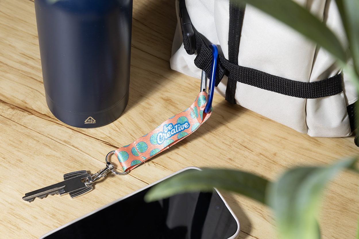 Mini přívěsek na klíče z polyesteru RPET vyrobený na zakázku se sublimačním potiskem po obou stranách. S malou kovovou a velkou karabinou z recyklovaného hliníku. Cena nezahrnuje tiskovou přípravu. Min. mn.: 100 ks.