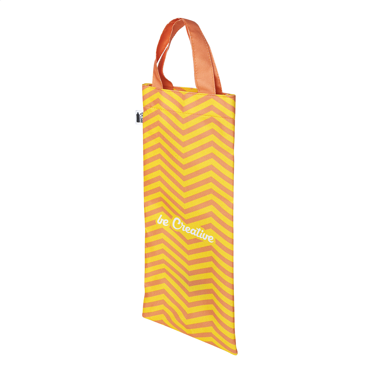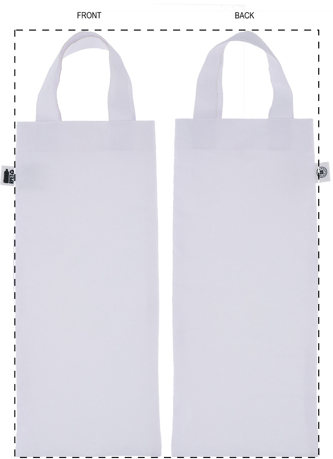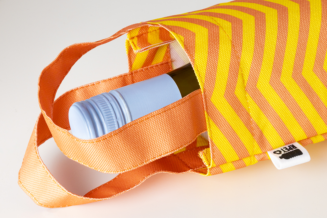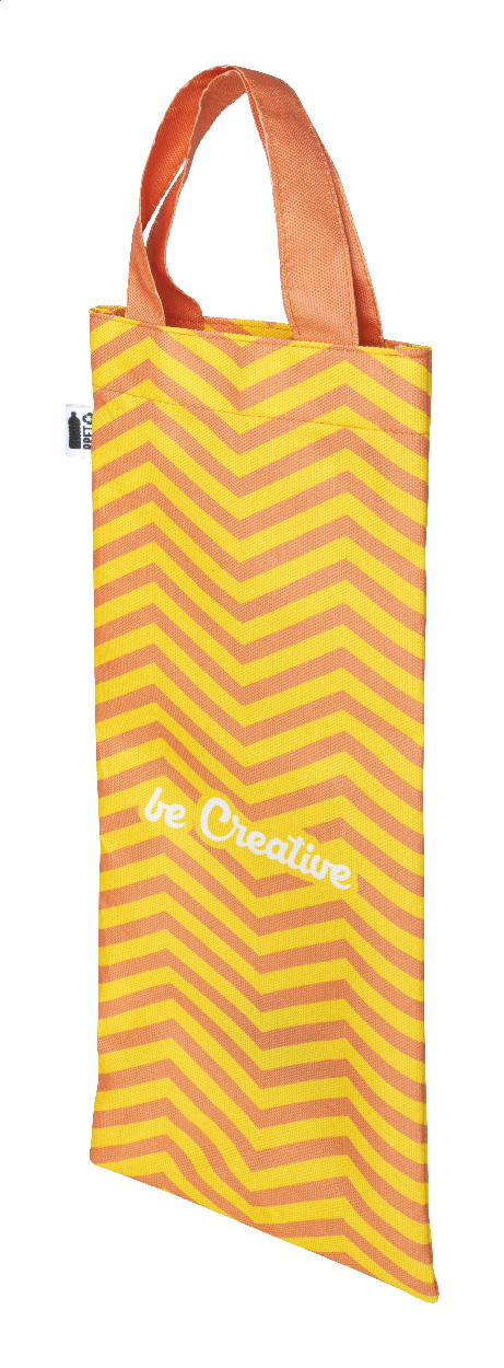 Taška na víno z polyesteru 600D RPET s krátkými uchy, vyrobená na zakázku. S celoplošným sublimačním potiskem a výraznou RPET etiketou. Cena nezahrnuje tiskovou přípravu. Min. mn.: 25 ks.