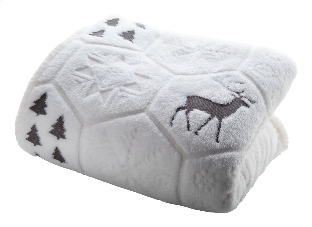 Luxusní vánoční deka 270 g/m² z flanelového fleecu a oboustrannou 210 g/m² fleecovou podšívkou. Zabalené stuhou a potištěným papírovým pásem.