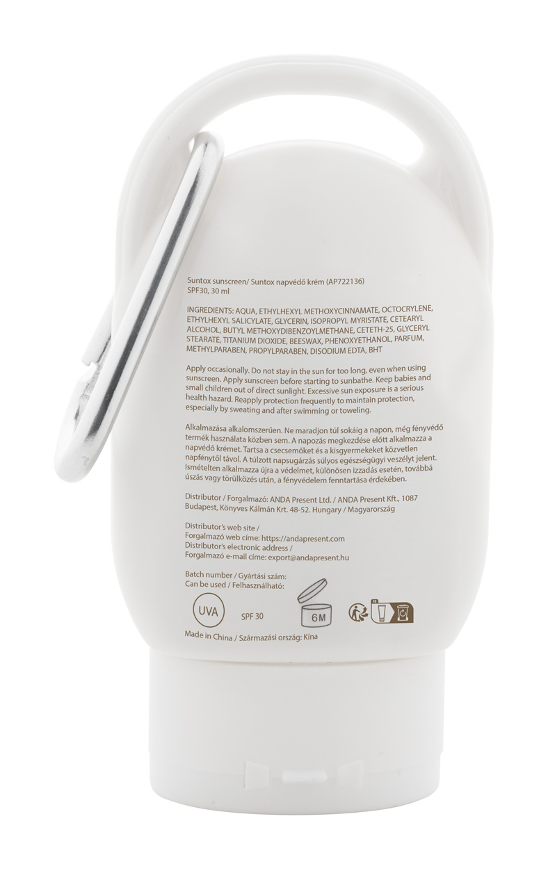 Mléko na opalování v plastové lahvičce s barevným víčkem a stejně barevnou kovovou karabinou. Ochrana SPF30, objem 30 ml.