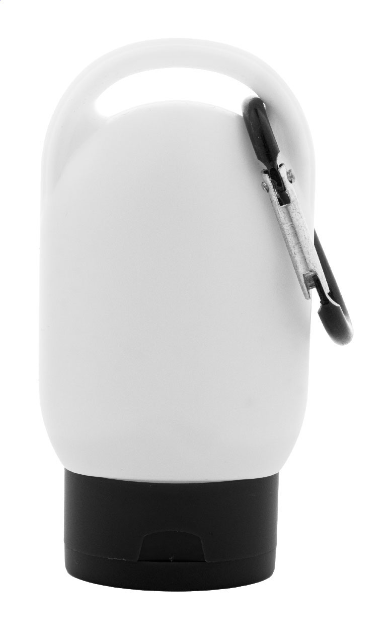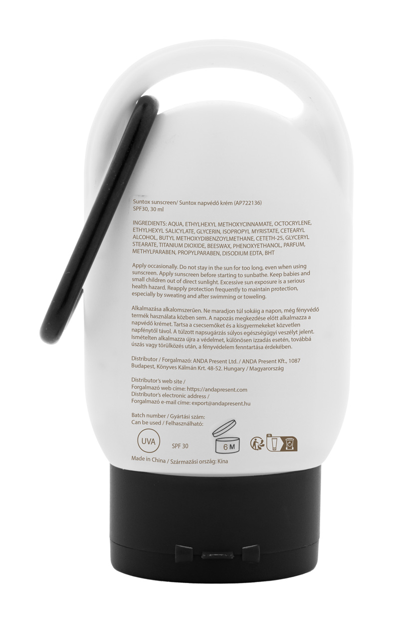 Mléko na opalování v plastové lahvičce s odpovídající barevnou krytkou a karabinou. Ochrana SPF30, 30 ml.