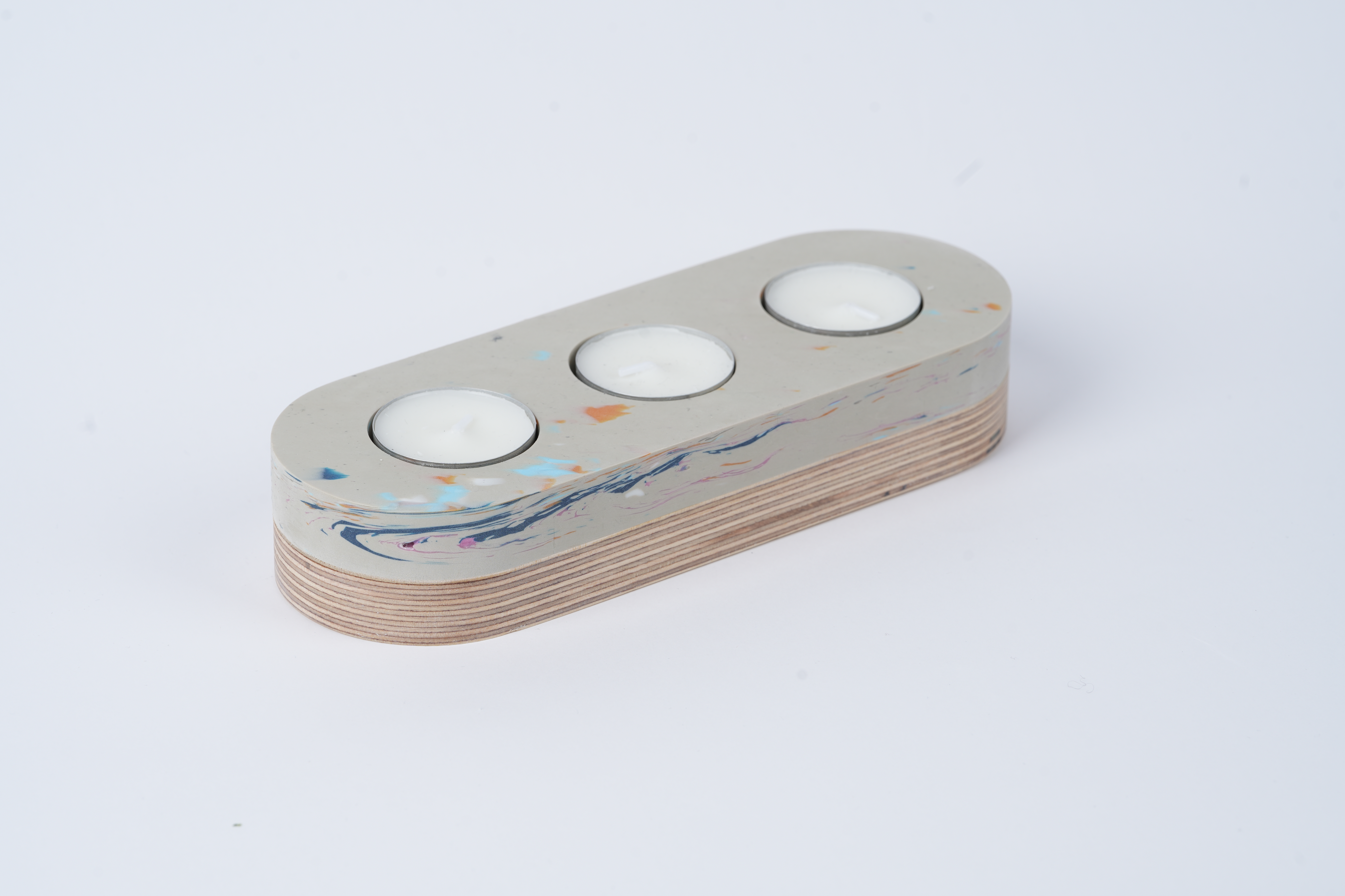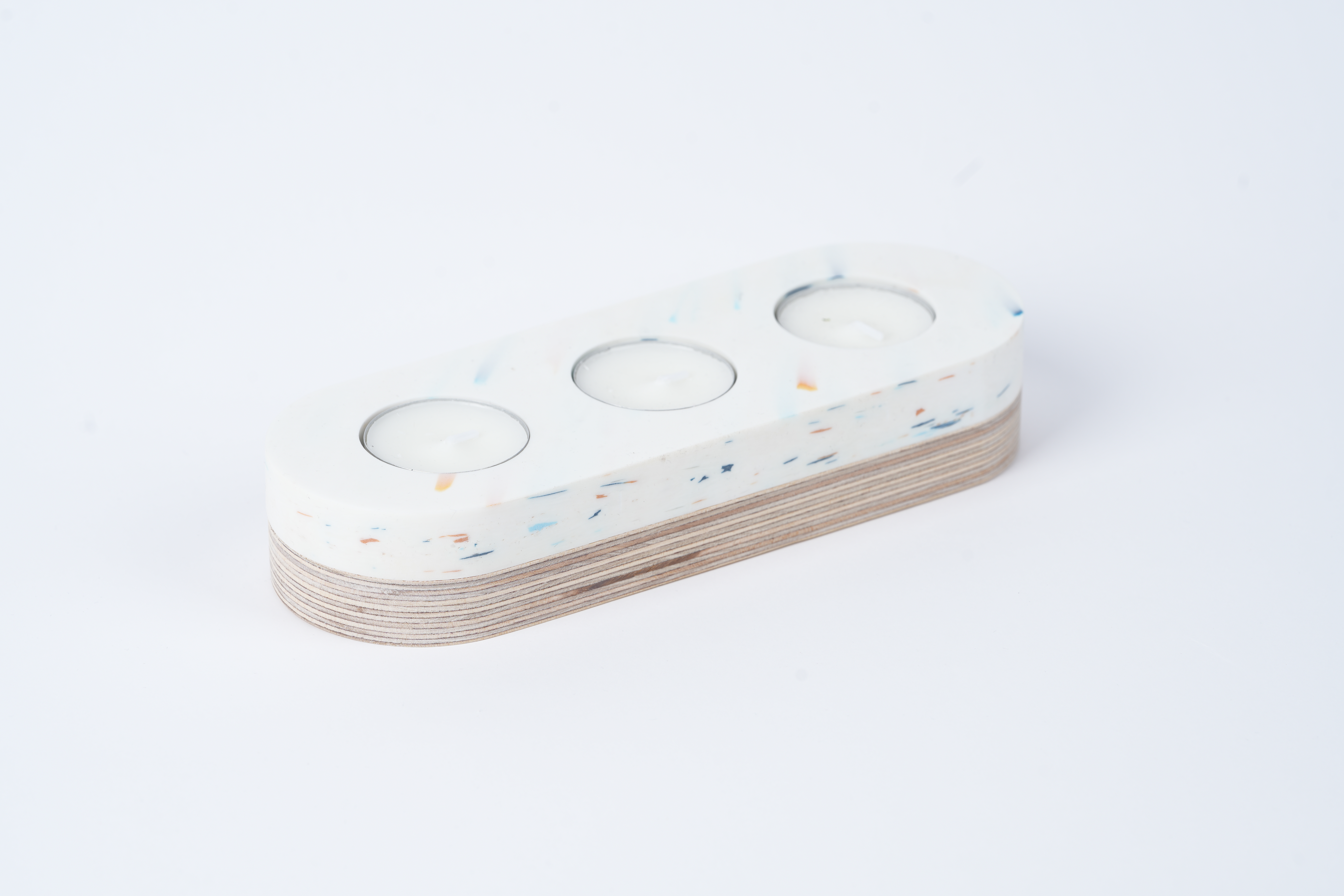 Svícen na tři čajové svíčky z recyklovaného plastu, doplněn o dřevěný stojan z bukové překližky.