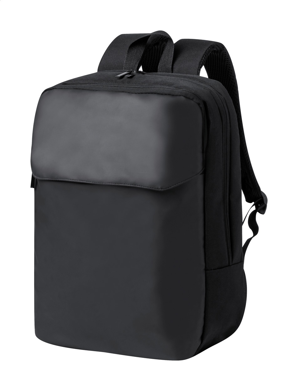 Batoh z PU kůže a polyesteru s přihrádkami na zip, polstrovanou přihrádkou na notebook (15") a tablet (10"), polstrovaná záda a ramenní popruhy.