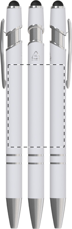 Praktické bílé pero z recyklovaného hliníku slouží k psaní na papír i k pohodlnému ovládání dotykových obrazovek. Pogumovaný povrch zabraňuje klouzání a chromované detaily dodávají psacímu nástroji moderní nádech.