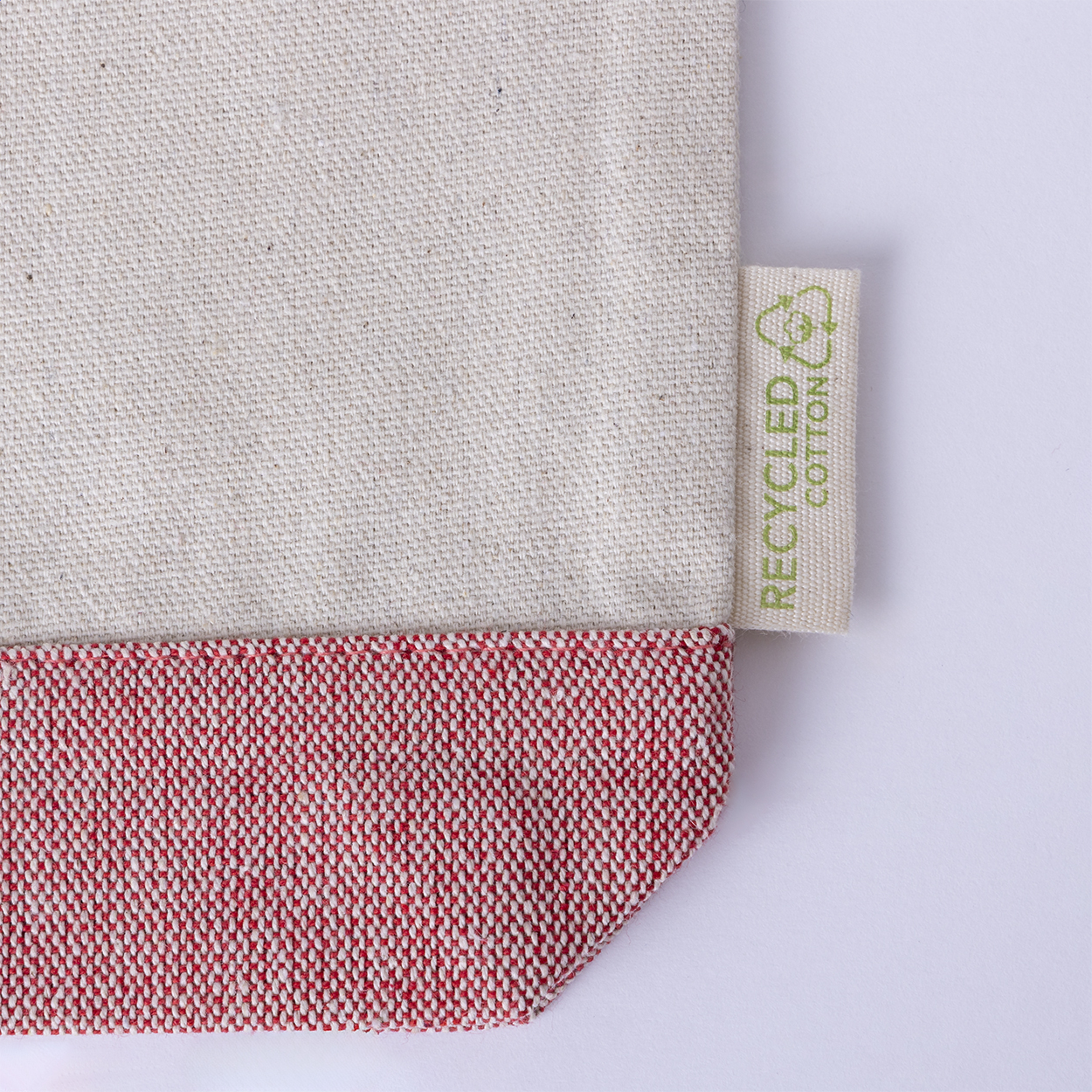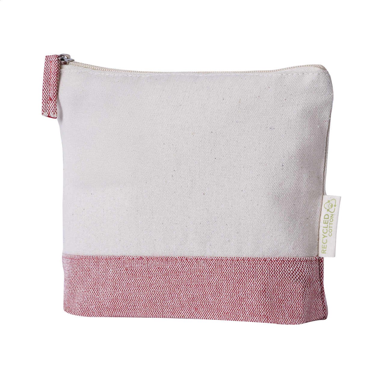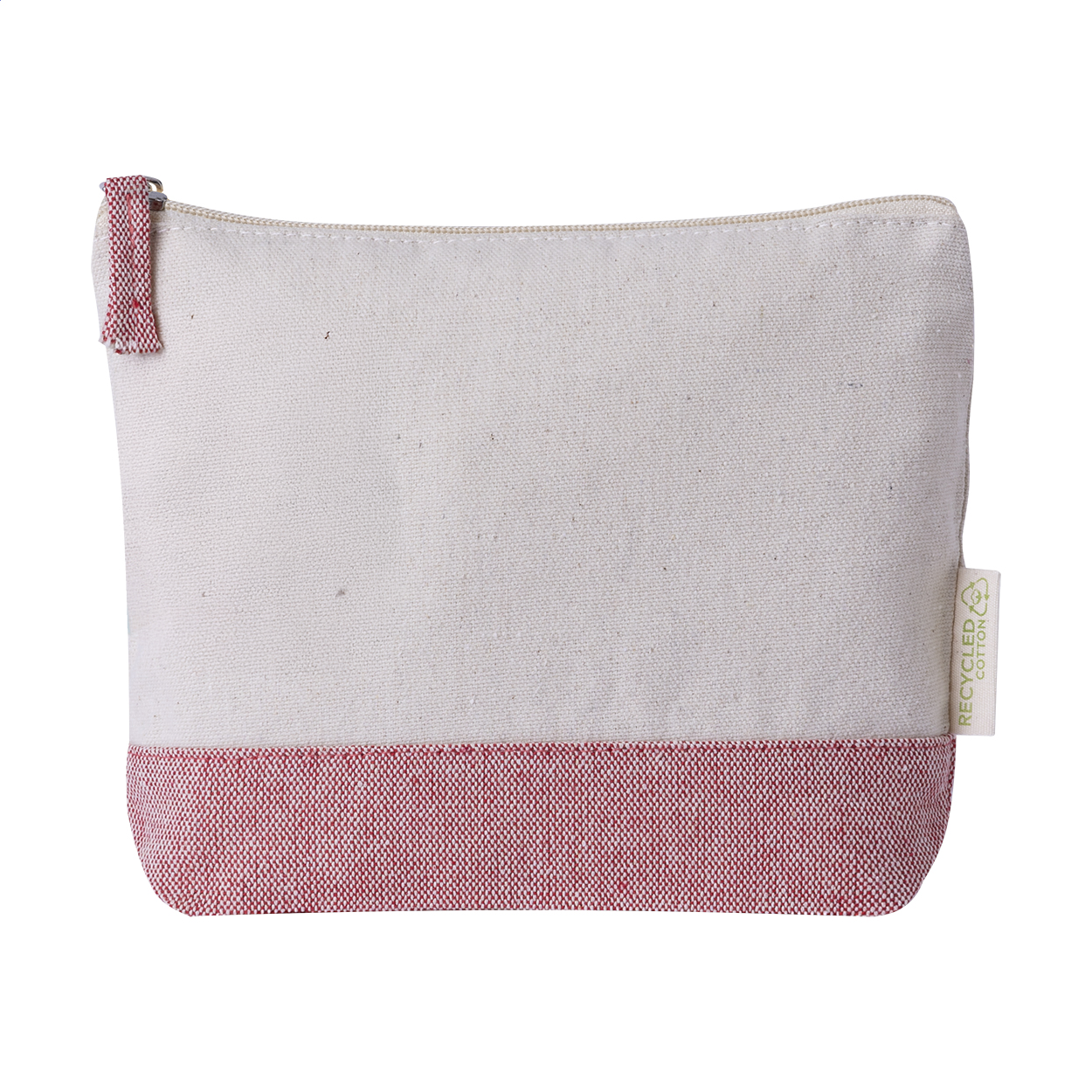 Dvoubarevná kosmetická taštička z recyklované bavlny na zip. 100% recyklovaná bavlna s výrazným štítkem z recyklované bavlny.