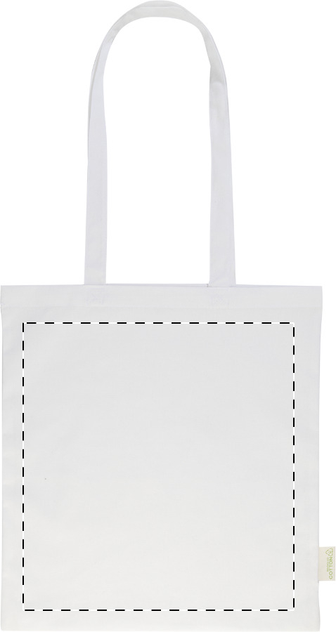 Nákupní taška s dlouhými uchy ze 70 % recyklované bavlny a 30 % RPET polyesteru, 140 g/m². S výraznou etiketou o recyklované bavlně.