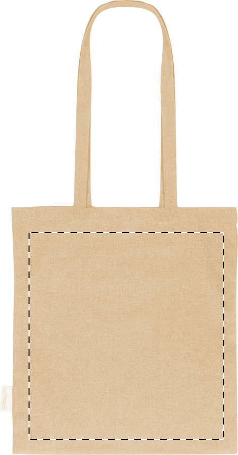 Nákupní taška s dlouhými uchy ze 70 % recyklované bavlny a 30 % RPET polyesteru, 140 g/m². S výraznou etiketou o recyklované bavlně.