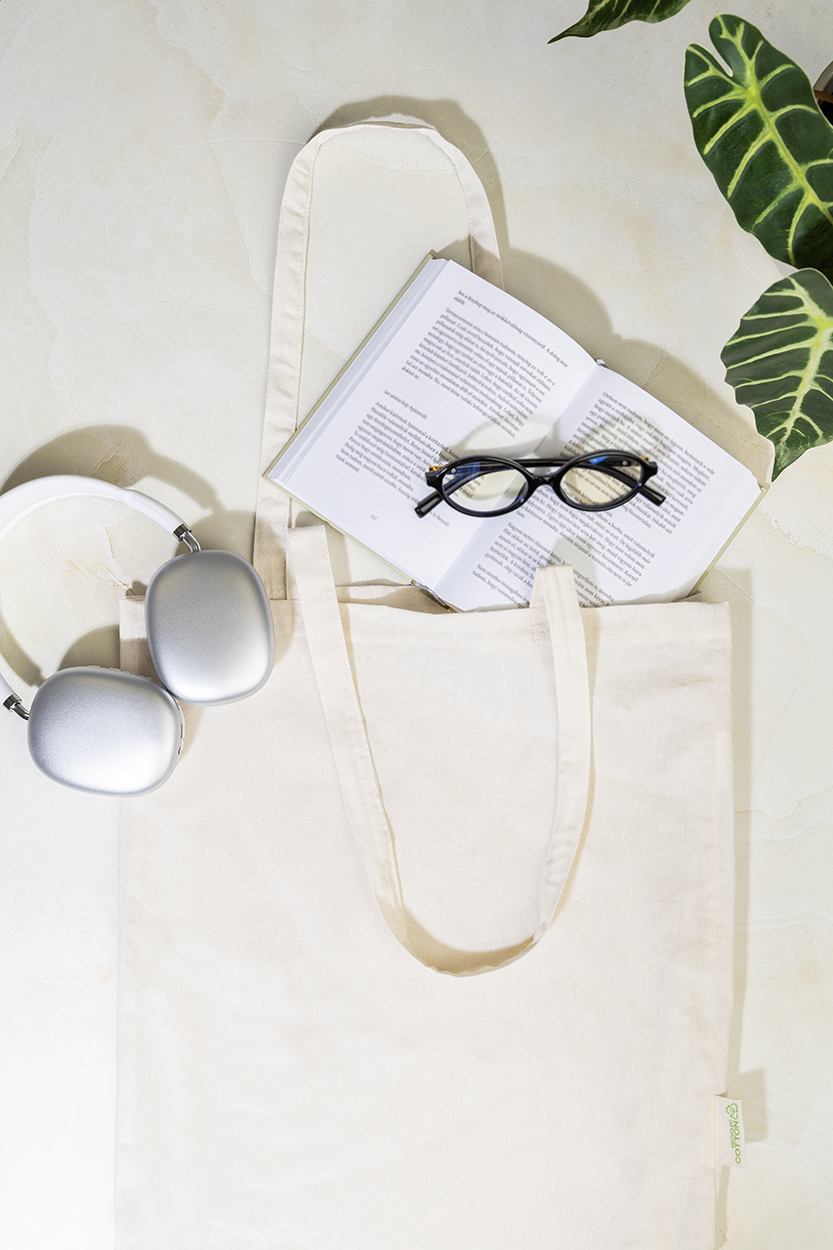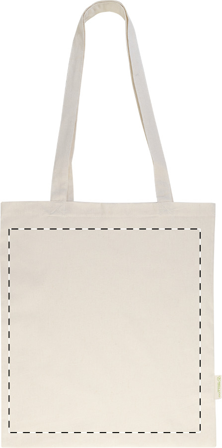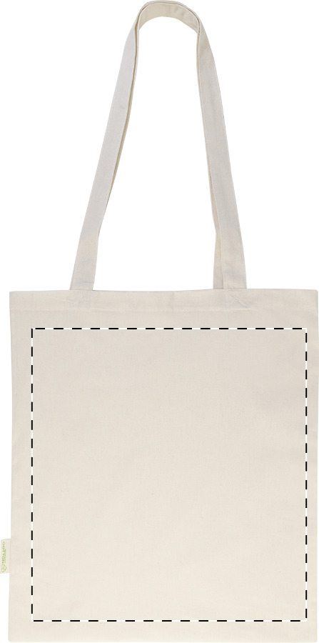 Nákupní taška s dlouhými uchy ze 70 % recyklované bavlny a 30 % RPET polyesteru, 140 g/m². S výraznou etiketou orecyklované bavlně.