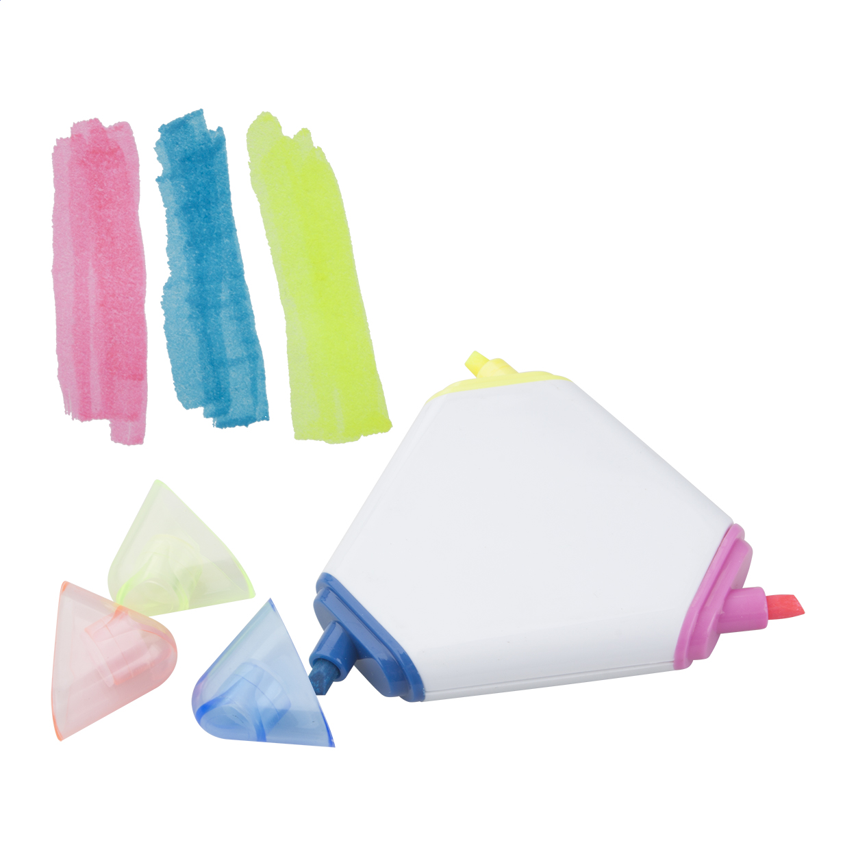 Trojbarevný plastový zvýrazňovač ve tvaru trojúhelníku s průhlednými víčky. Mechanismus: víčko. Certifikace Capped.