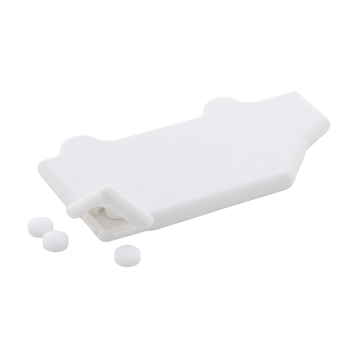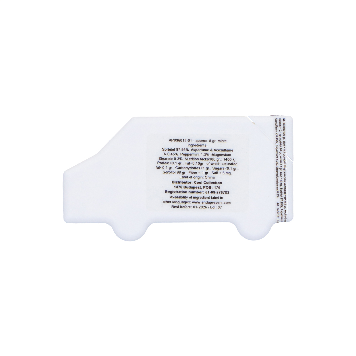 Plastový dávkovač mintových bonbónů ve tvaru auta s cca. 8 gramů mentolových bonbonů bez cukru.