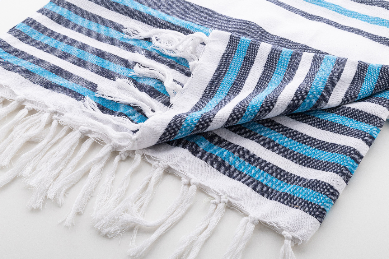 Tříbarevný pruhovaný plážový ručník pareo ze 100% bavlny, 210 g/m². Dvoubarevný pruhovaný plážový ručník pareo ze 100% bavlny, 210 g/m².