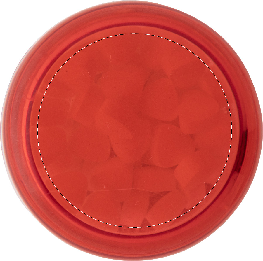 Kulatá průhledná plastová dóza s mintovými bonbóny s barevným šroubovacím víčkem. Obsahující cca. 12 gramů mentolových bonbonů bez cukru.