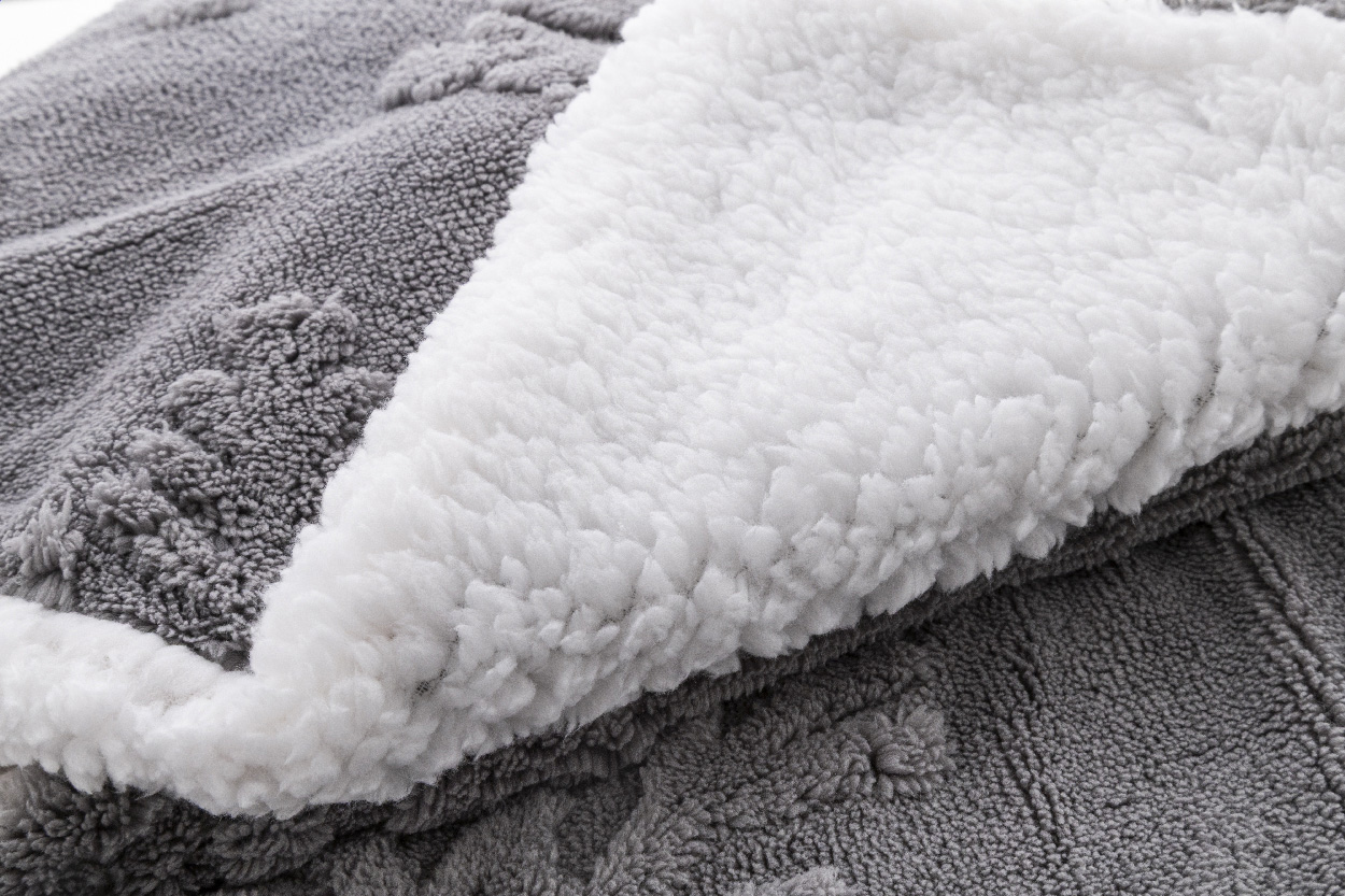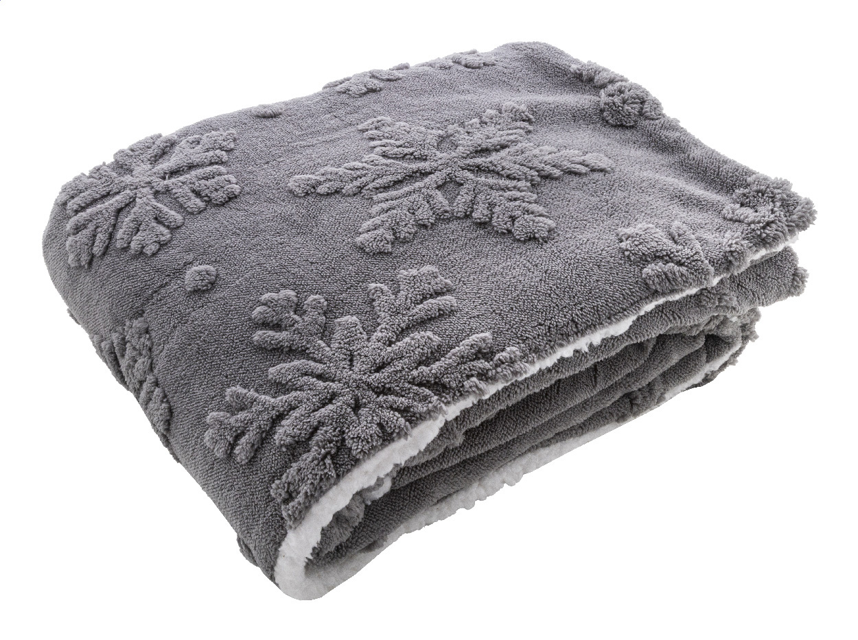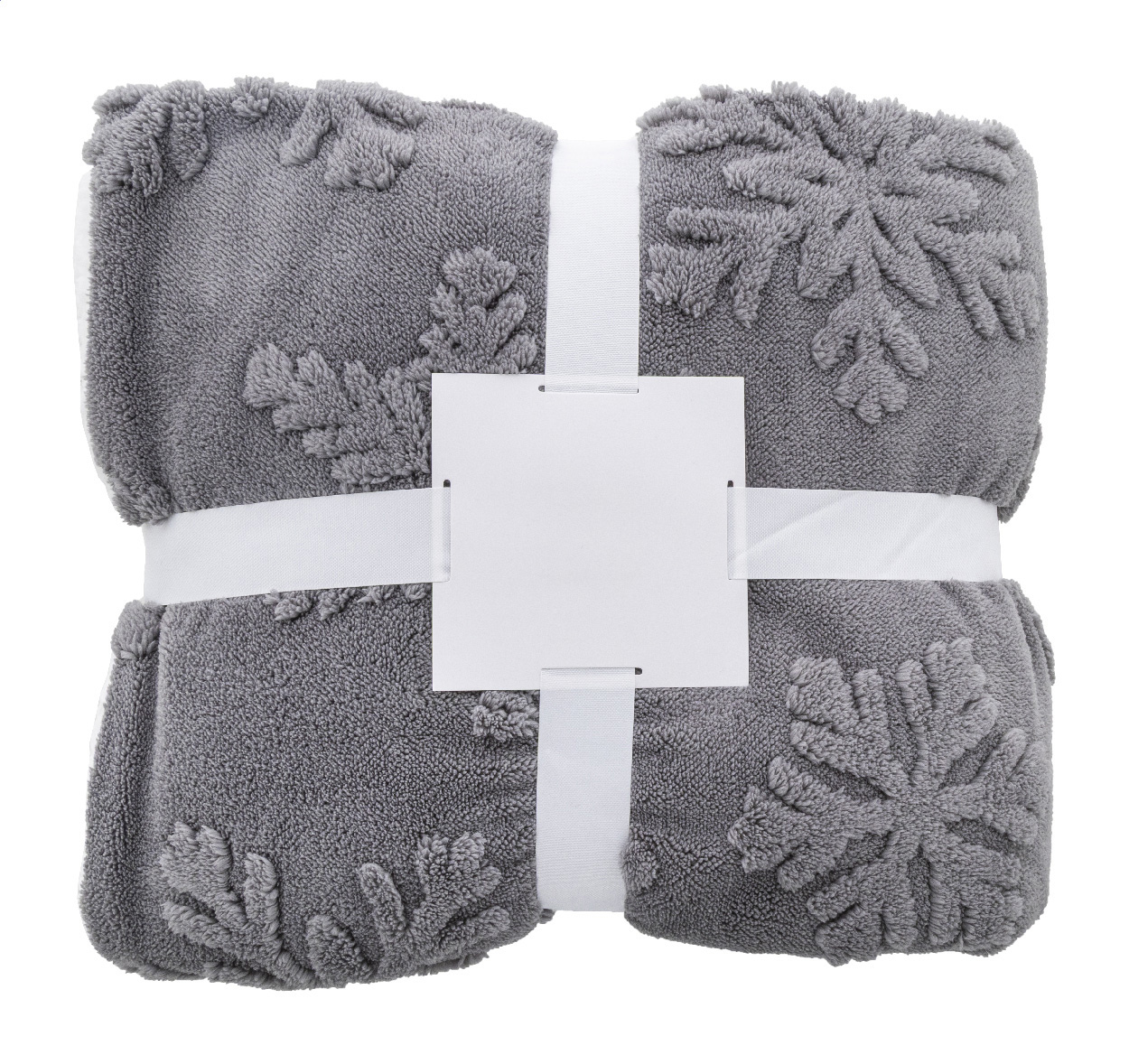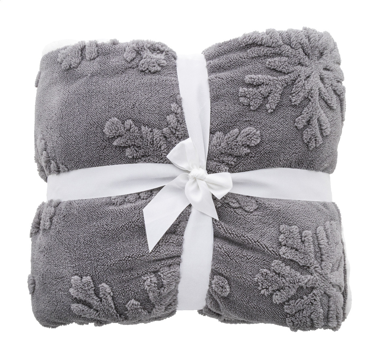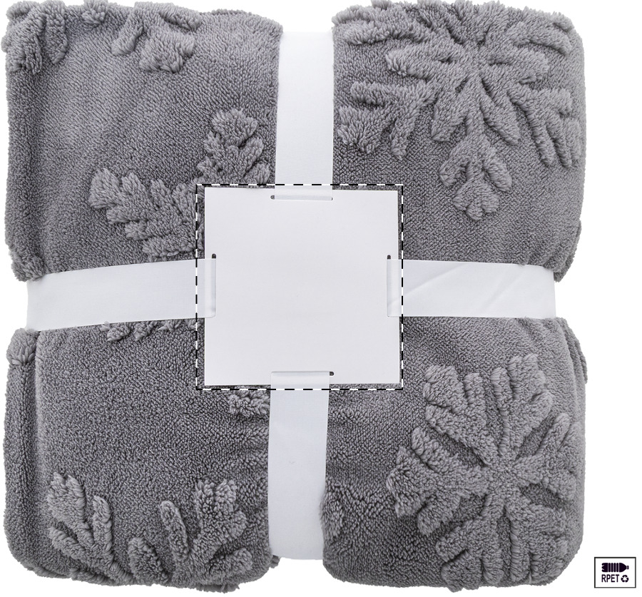 Luxusní dvouvrstvá vánoční deka z RPET s žakárovým vzorem sněhových vloček. S korálovým fleecovým materiálem RPET 260 g/m² a oboustrannou podšívkou z RPET sherpa fleecu 210 g/m². Zabaleno do stuhy a tisknutelného papírového kartonu.