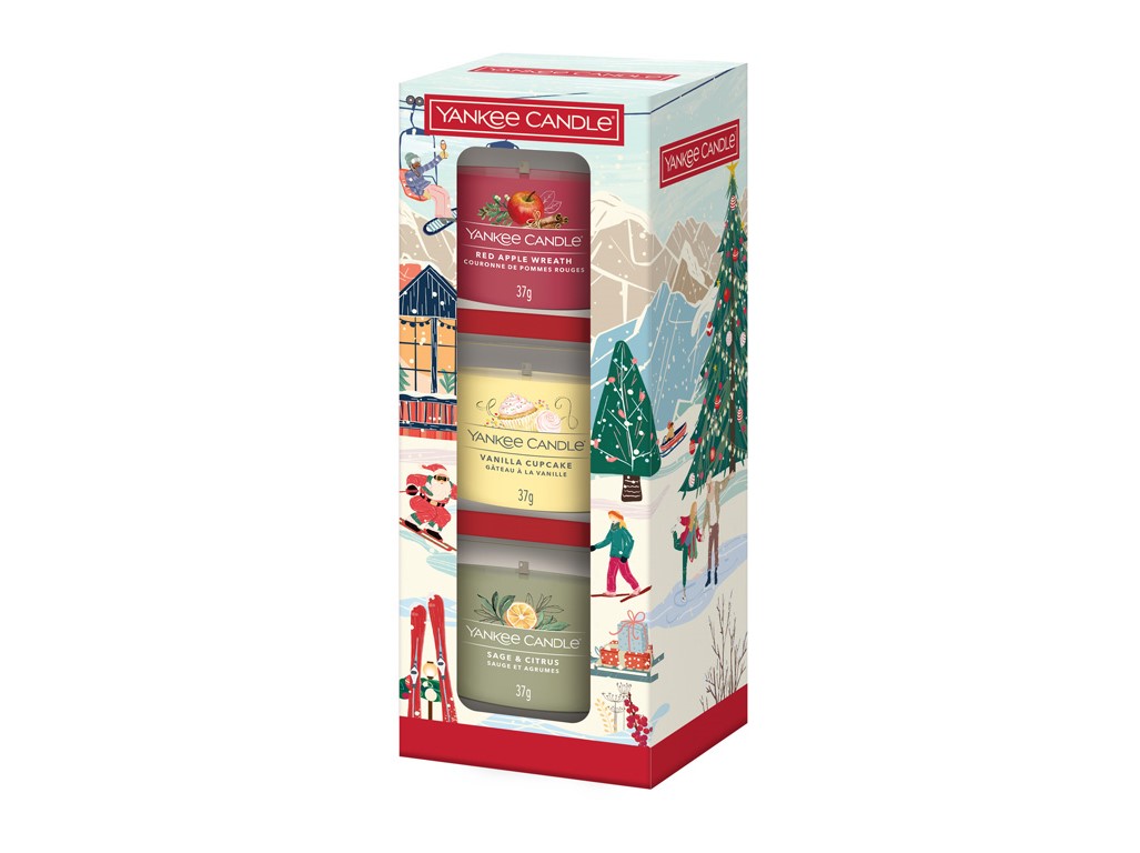 Tato vánoční sada je nenákladným a krásným dárkem pro vaše partnerky, kamarádky či kolegyně. Mohou vyzkoušet hned 3 vůně od Yankee Candle, a to: Red Apple Wreath, Sage & Citrus, Vanilla Cupcake. Jde o velmi oblíbené provedení skleněné votivní svíčky. K jejímu rozpouštění nepotřebujete svícínek a po vypálení vám zbyde hezký skleněný kalíšek třeba na čajovou svíčku. Každá voní až 10 hodin a intenzita vůně vás i při malé velikosti svíčky příjemně překvapí! U objednávek nad 50 ks je nutné ověřit dostupnost u obchodníka.