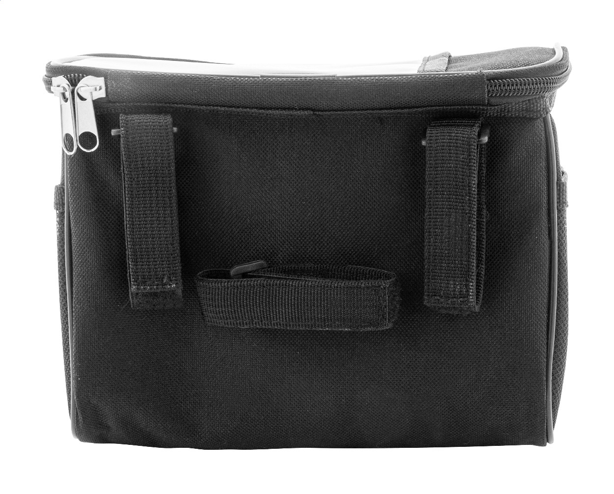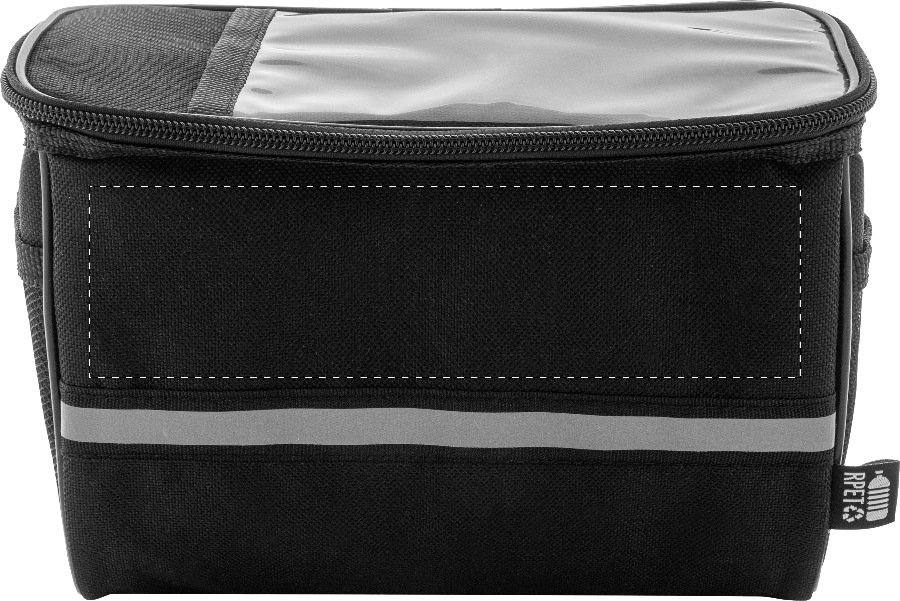 Brašna na řídítka kola z RPET s přihrádkou na zip, kapsou na mobil s dotykovou obrazovkou, bočními síťovanými kapsami, nastavitelnými popruhy na suchý zip a reflexním proužkem. Polyester 600D RPET s výrazným štítkem RPET.