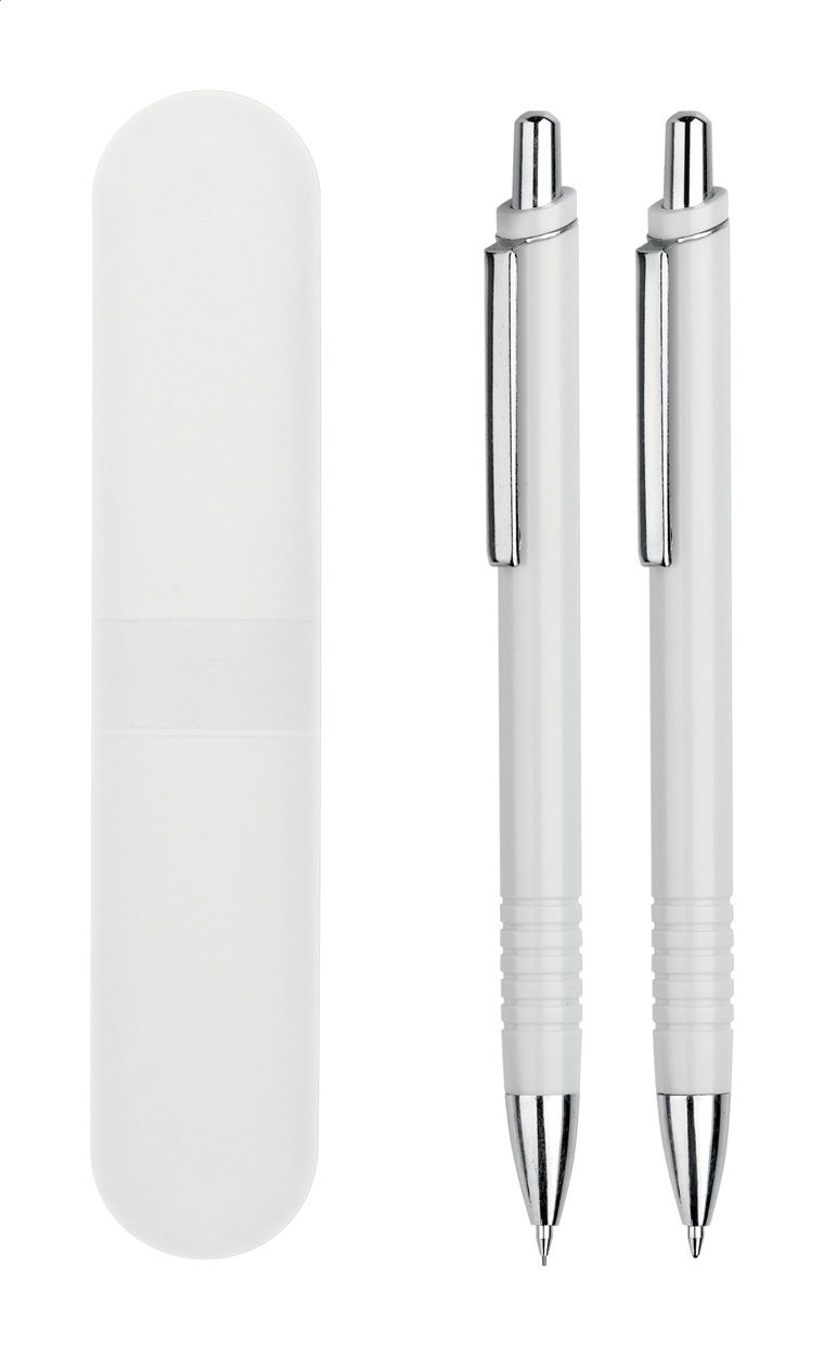 Sada plastového kuličkového pera s modrou náplní a mechanické tužky (0,7mm tuha) v plastové krabičce.