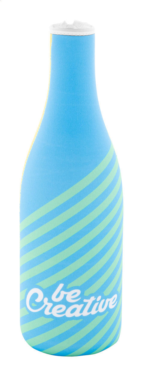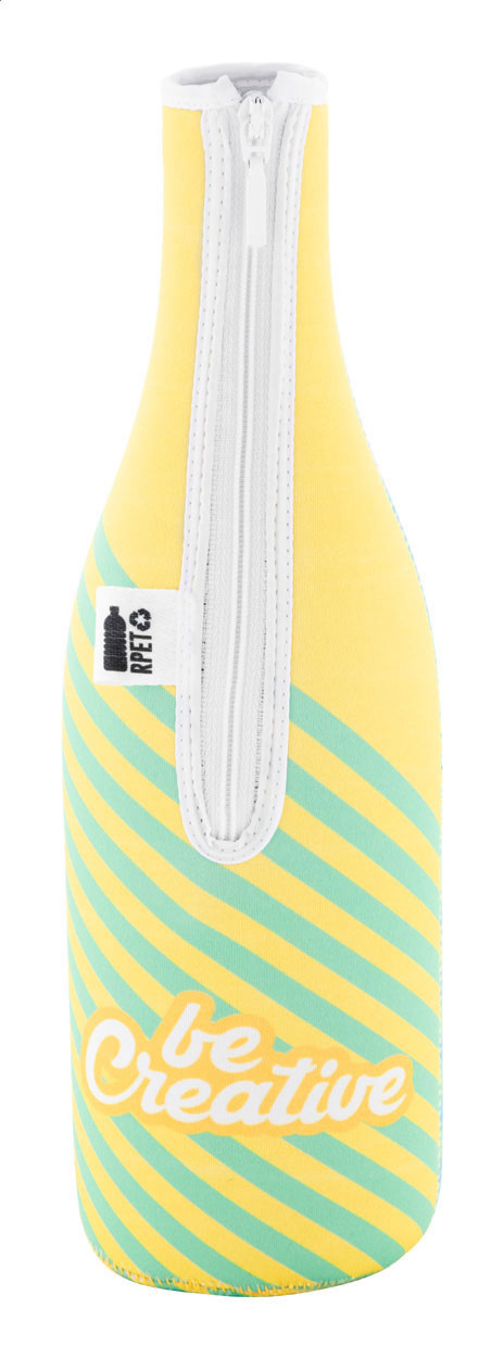 Na zakázku vyrobený neoprenový obal na láhev vína nebo šampaňského z materiálu RPET se zipem. S celoplošným sublimačním potiskem. MOQ: 25 ks.