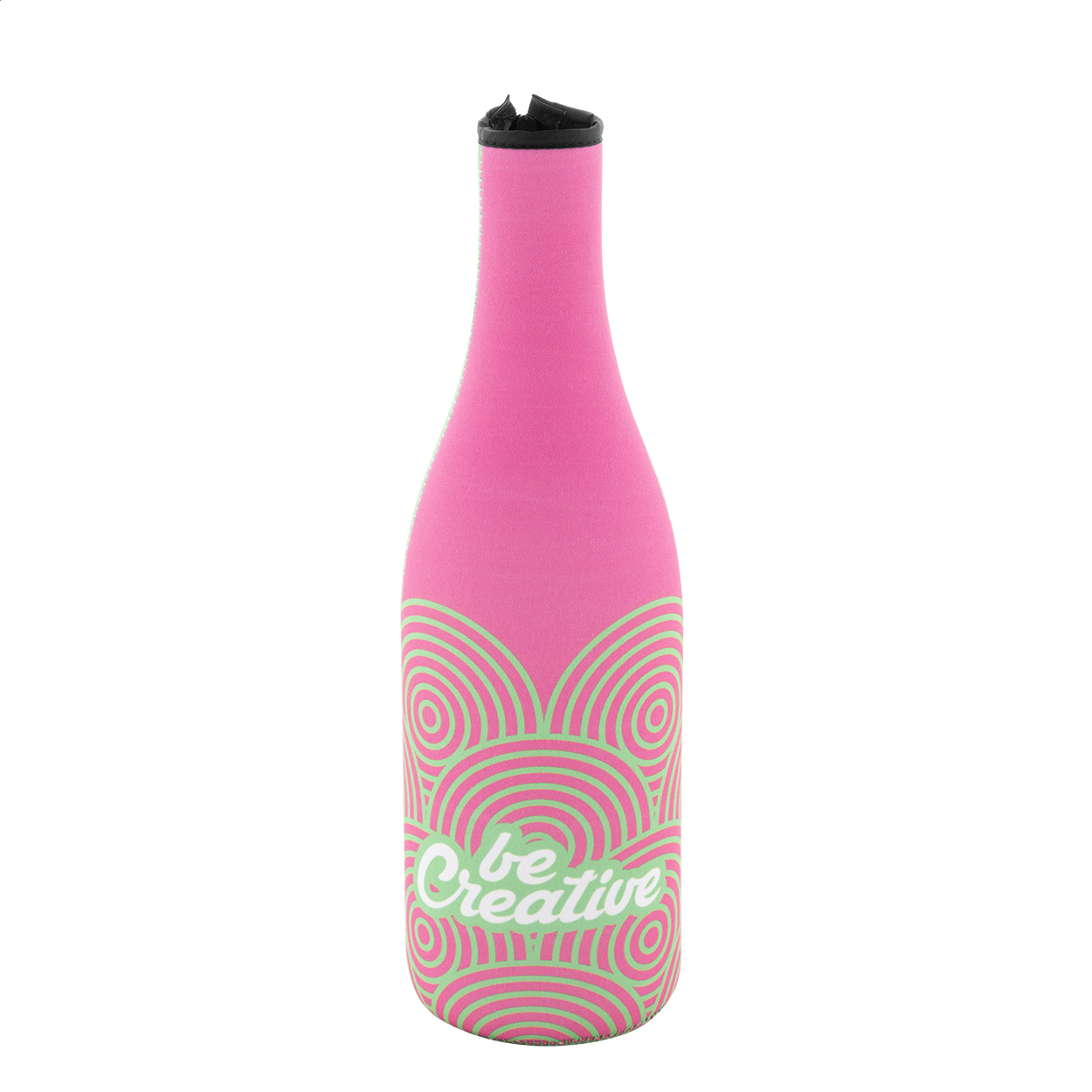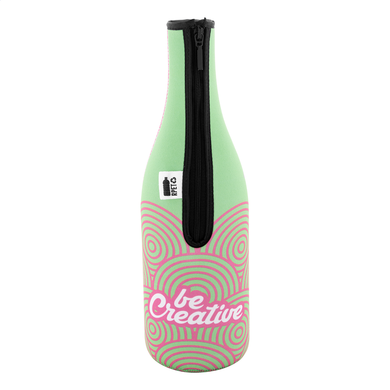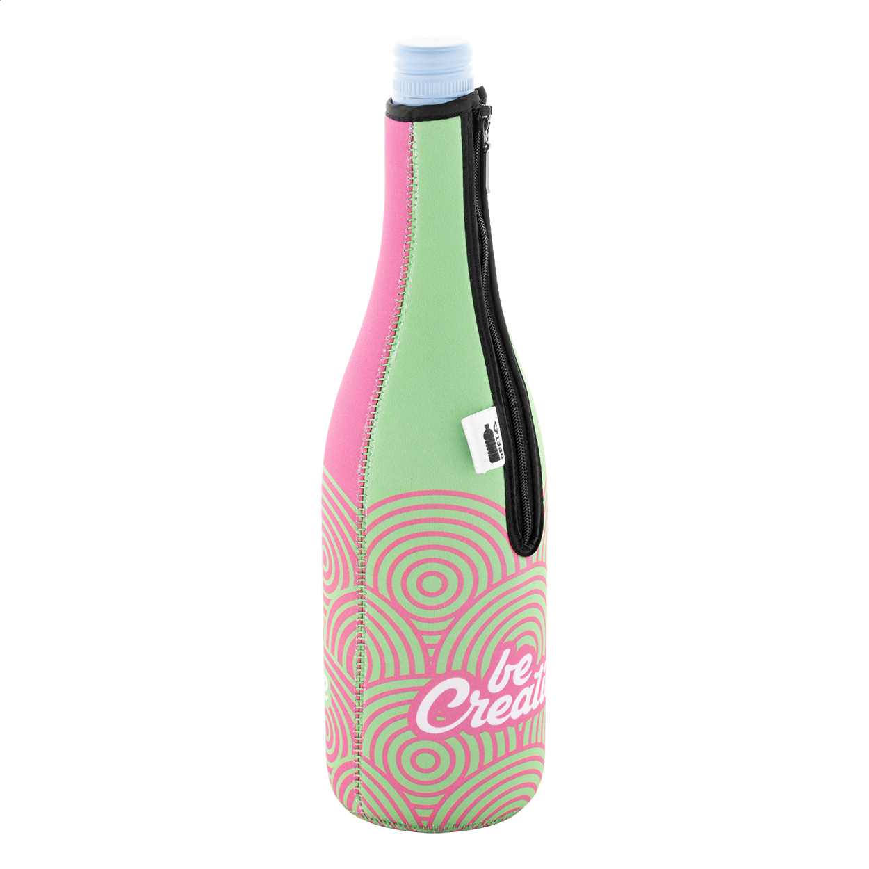 Na zakázku vyrobený neoprenový obal na láhev vína nebo šampaňského z materiálu RPET se zipem. S celoplošným sublimačním potiskem. MOQ: 25 ks.