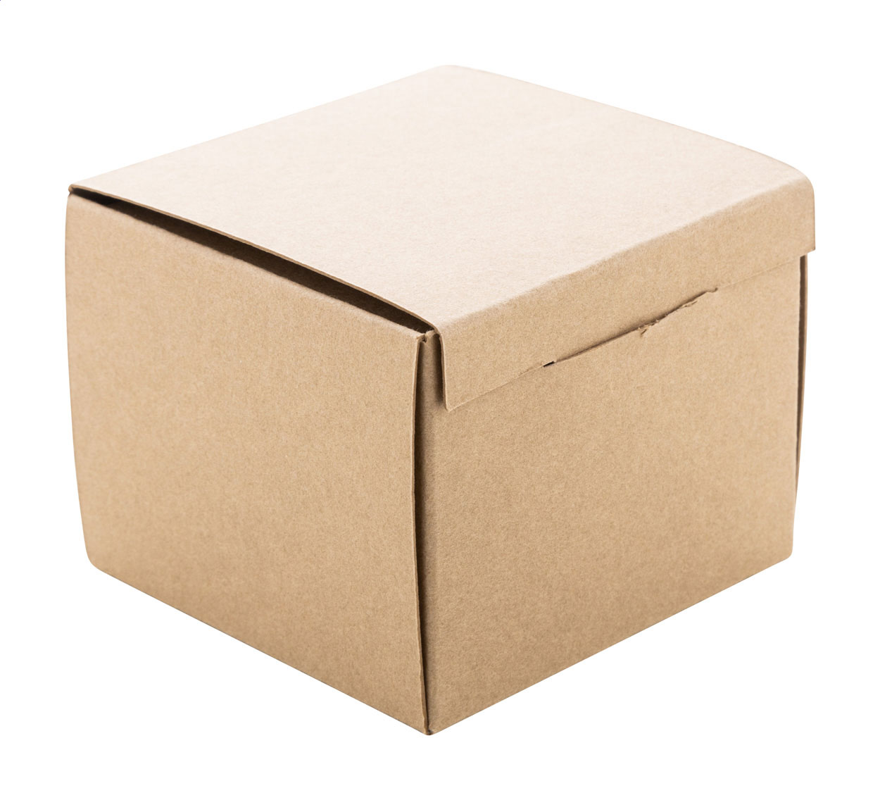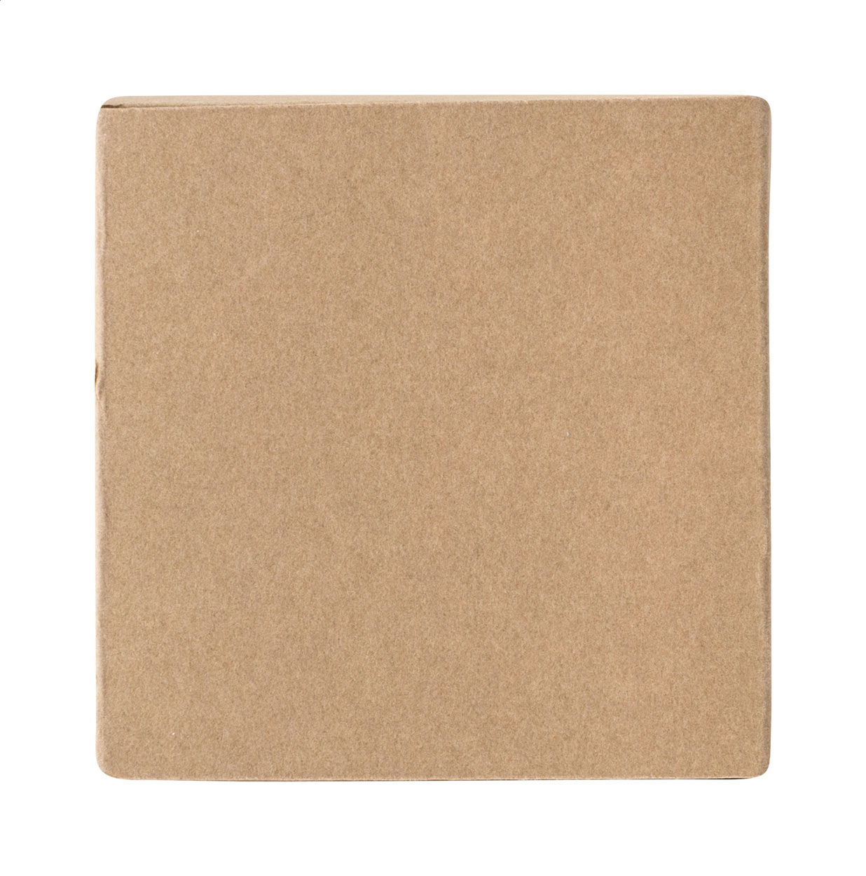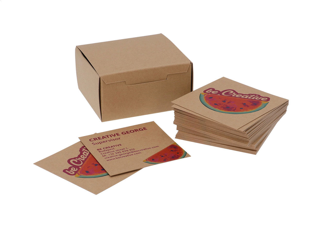100 ks vizitek čtvercového tvaru vyrobených na zakázku s oboustranným barevným potiskem. Matný kraftový papír, 300 g/m². V kraftové papírové krabičce.