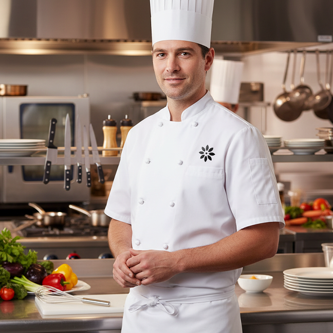 Kuchyňská bunda s krátkým rukávem (110 g/m²) z bavlny (35 %) a polyesteru (65 %). Se zapínáním na dva knoflíky a 1 náprsní kapsou
