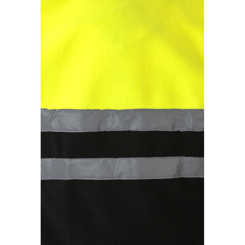 Dvoubarevná fleecová bunda (280 g/m²), z polyesteru (100%). S centrálním zipem, elastickými manžetami a nastavitelnou zátkou na boku. Reflexní pruhy na trupu a rukávech. Obsahuje tři kapsy, na zip. Výrobek v souladu s nařízením EU 2016/425, certifikovaný podle EN20471 a třídy č. 1