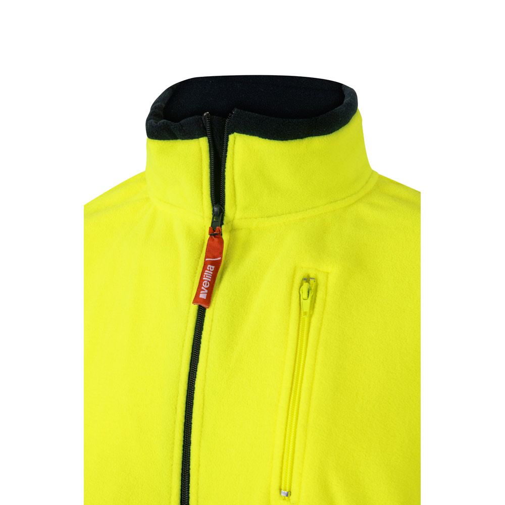 Dvoubarevná fleecová bunda (280 g/m²), z polyesteru (100%). S centrálním zipem, elastickými manžetami a nastavitelnou zátkou na boku. Reflexní pruhy na trupu a rukávech. Obsahuje tři kapsy, na zip. Výrobek v souladu s nařízením EU 2016/425, certifikovaný podle EN20471 a třídy č. 1