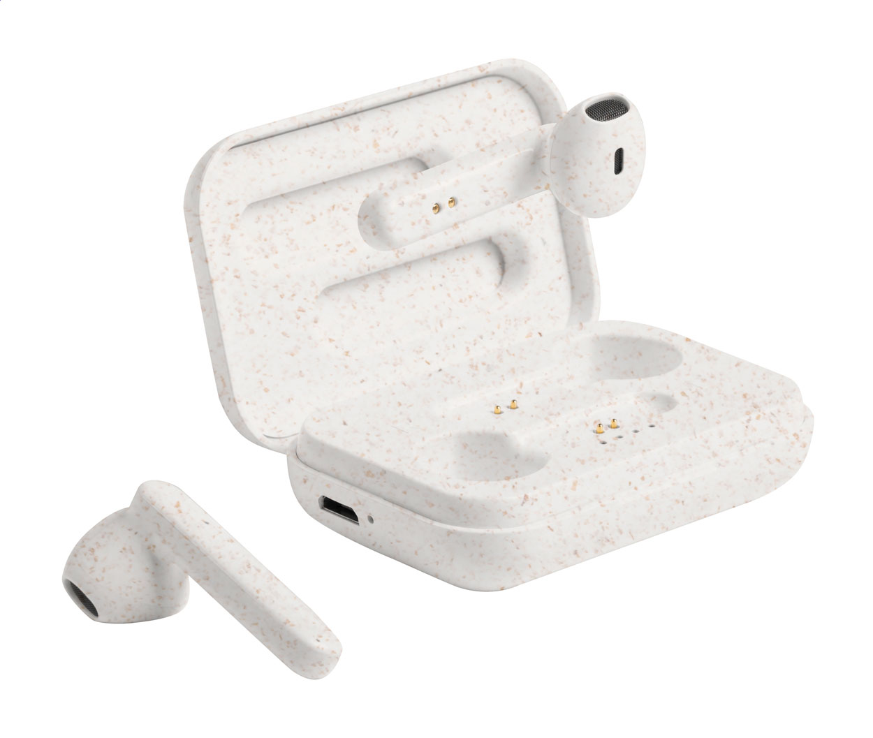 Zažijte pohodlí s bezdrátovými sluchátky VOUNEL. Tato sluchátka, vyrobená z plastu s příměsí pšeničné slámy, nabízí moderní design a funkci hands-free volání. Sluchátka jsou dodávána v nabíjecím pouzdru, které je vyrobeno ze stejného materiálu, což zajišťuje stylovou a praktickou ochranu a nabíjení sluchátek na cestách.