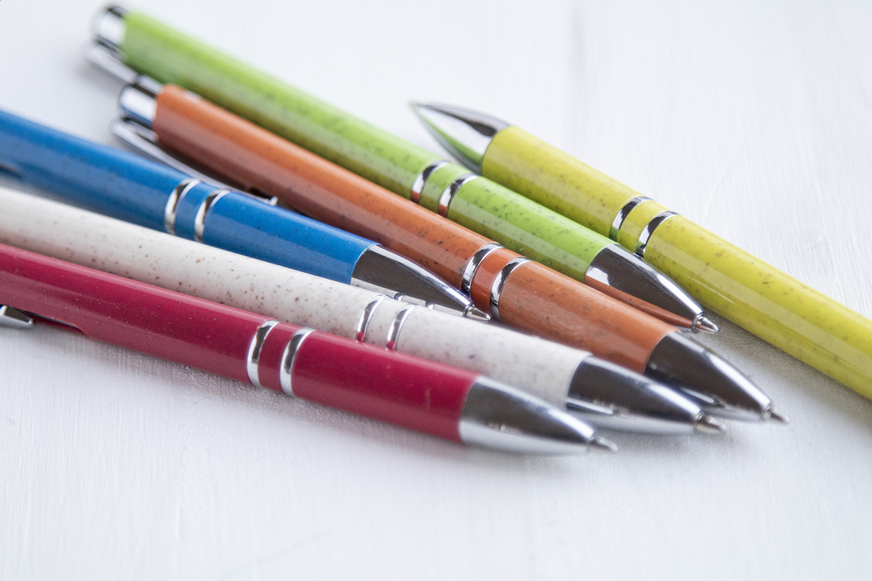 Kuličkové pero z plastu z pšeničných stébel. Kovové detaily, modrá náplň. Mechanismus: tlačítkový. Certifikace Push action.