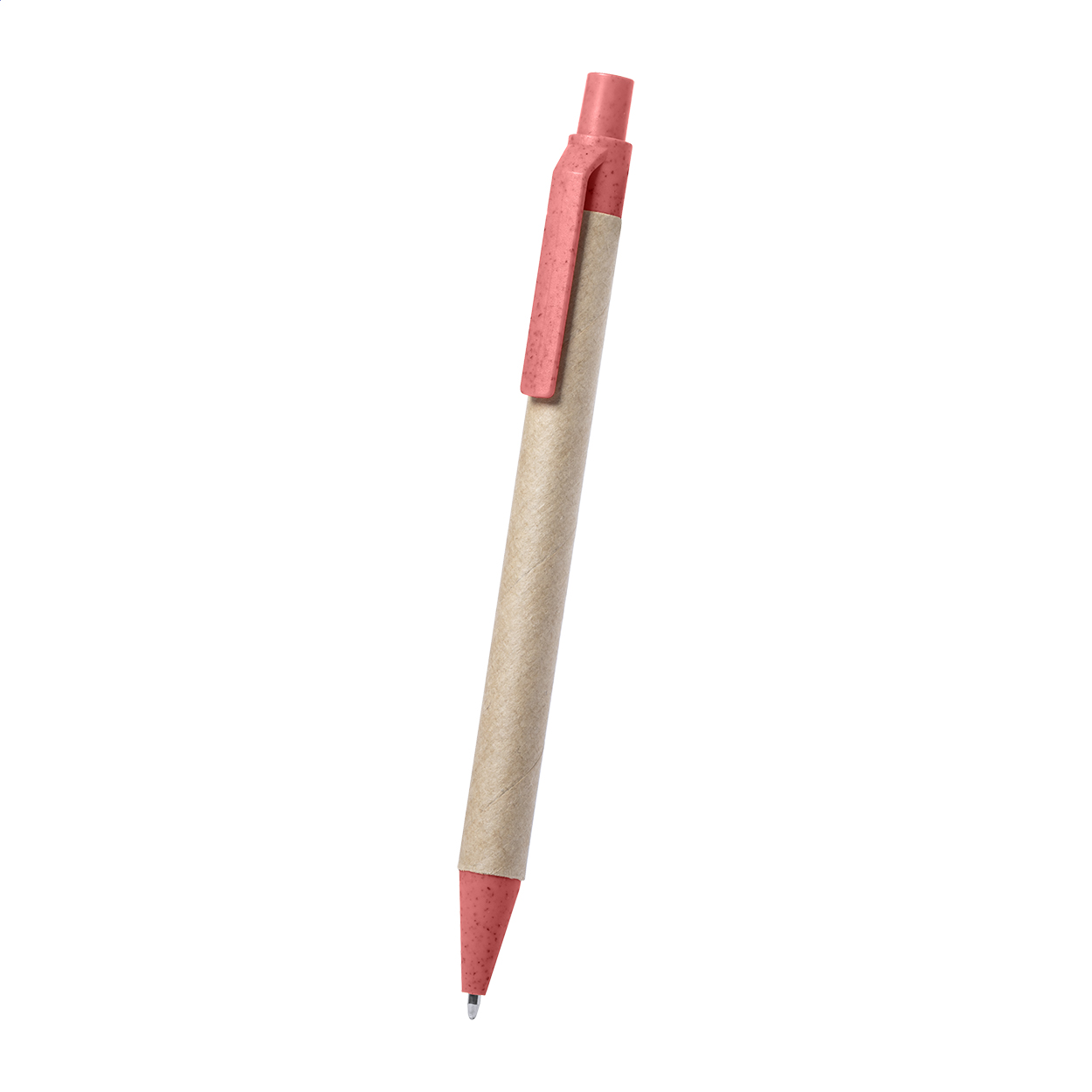 Kuličkové pero z recyklovaného papíru s částmi z plastu a pšeničné slámy. Mechanismus: tlačítkový. Certifikace Push action.