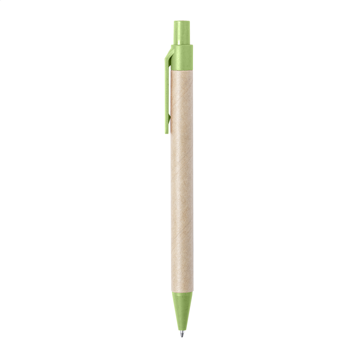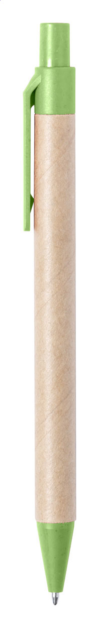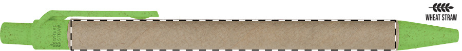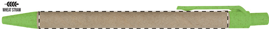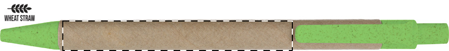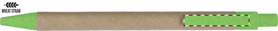 Kuličkové pero z recyklovaného papíru s částmi z plastu a pšeničné slámy. Mechanismus: tlačítkový. Certifikace Push action.
